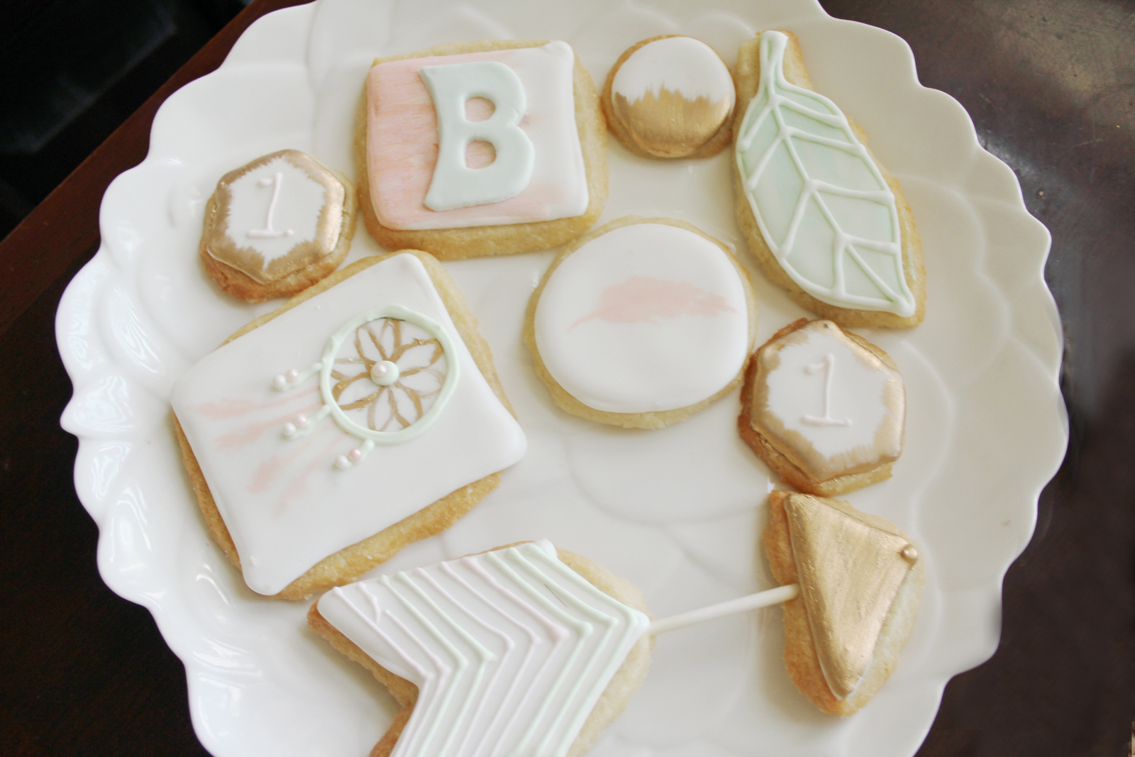 All 30 guests indulged in a white wedding cake (the flavor) with Italian Swiss meringue icing from Layered Bake Shop (exactly like the FitzPatricks’ wedding day cake) and topped with a custom cutout from Sweet Savanna. The honoree had her own vanilla smash cake, and her friends nibbled iced cookies cut in geometric shapes.