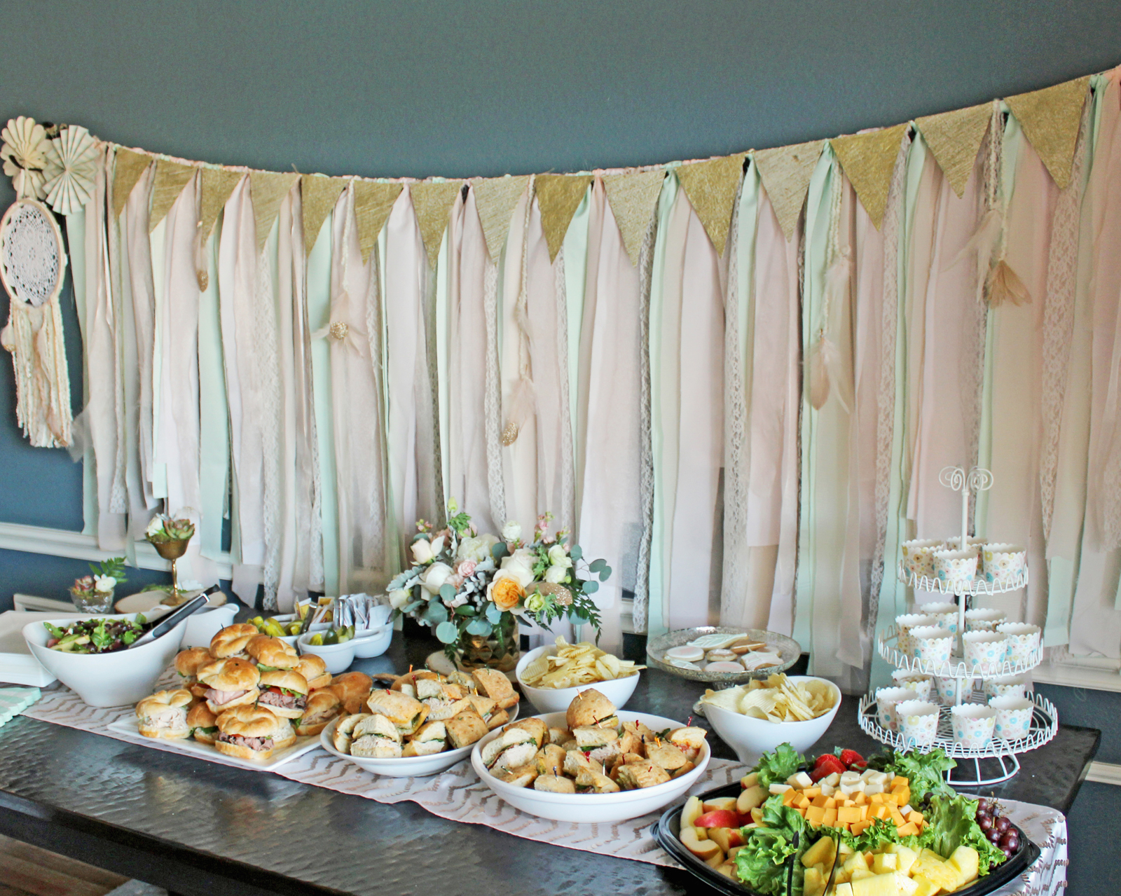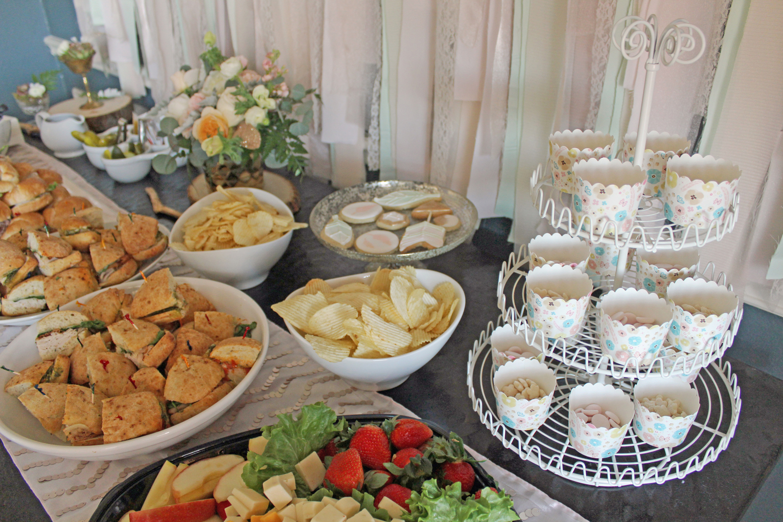 Brynn and the other tots played in a pint-size teepee filled with toys while adults munched on sandwiches, salads and snacks catered by Jason’s Deli. To set the scene for the buffet-style lunch, Courtney DIY-ed a fabric garland and faux flower arrangements.