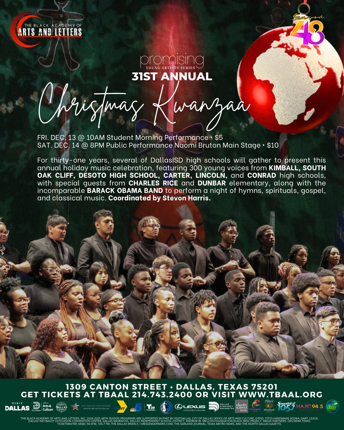 The Black Academy of Arts and Letters (TBAAL) presents the 31st annual Christmas Kwanzaa Musical Celebration. Over 300 young voices from Dallas ISD schools and the incomparable Barack Obama Band will perform a night of hymns, spirituals, gospel, and classical music.