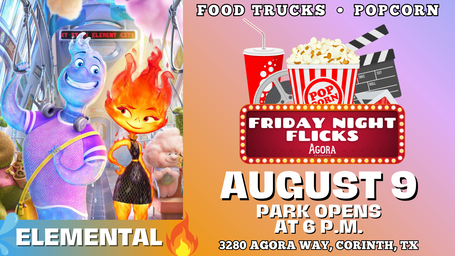 The final Friday Night Flicks of the summer featuring Elemental is showing on Friday, August 9 at the Commons at Agora, in Corinth, Texas.