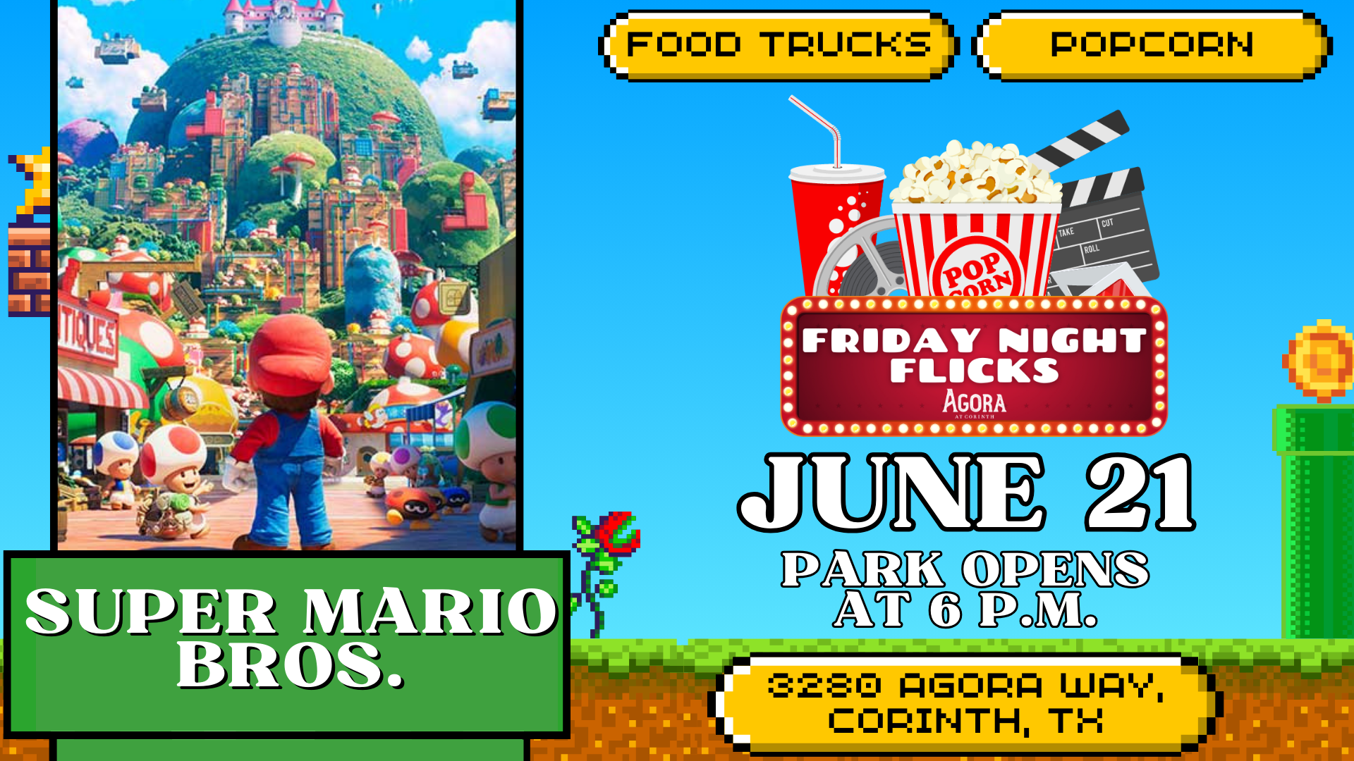 It's showtime! Agora at Corinth presents Friday Night Flicks, a summer movie series! The Super Mario Bros. Movie is taking the big screen at the Commons at Agora on Friday, June 21! Don’t miss this fun and action-packed tribute to the classic video game. Come by early to take a turn in the Game Truck and grab a bite to eat at the food trucks.