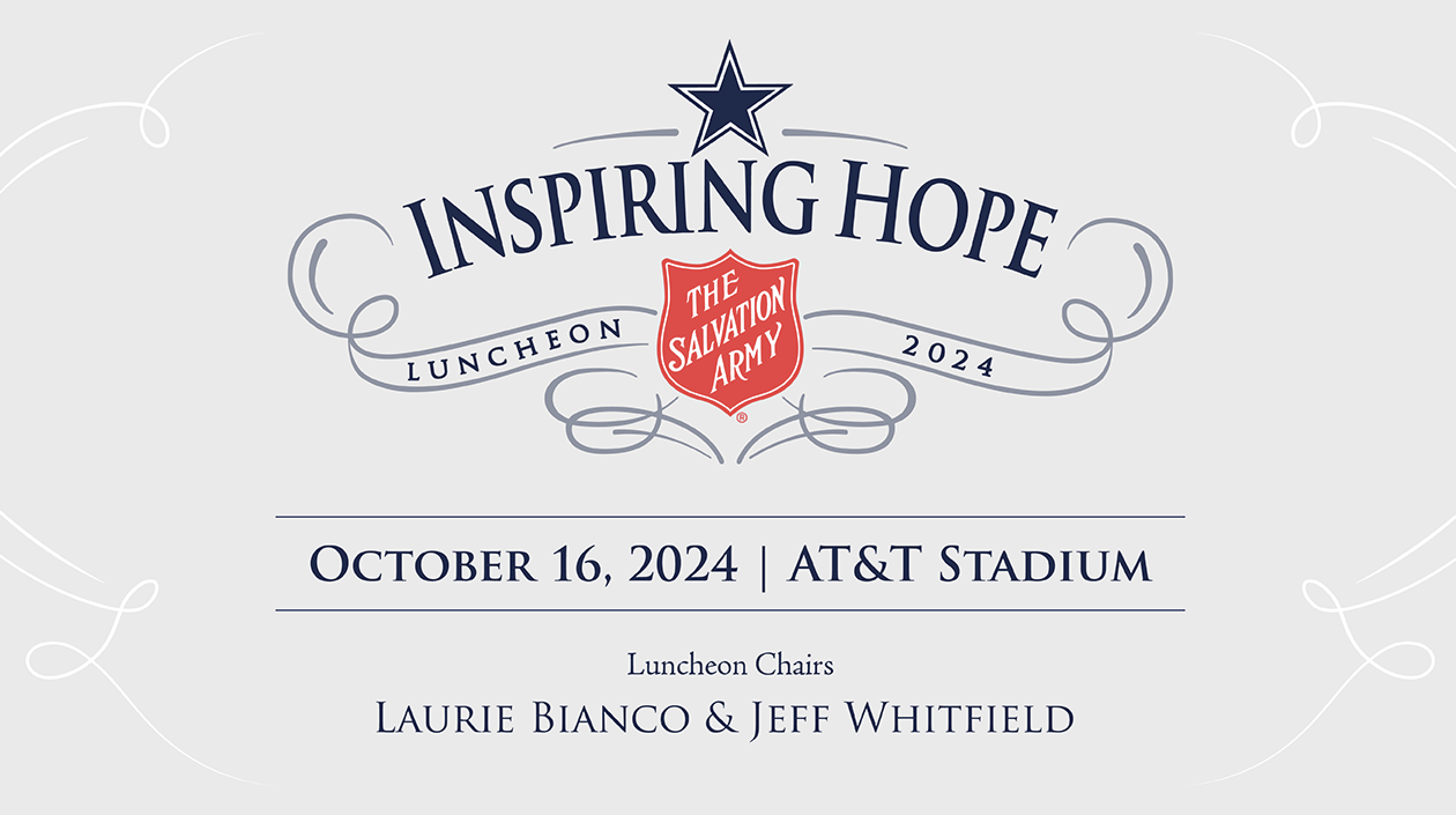Supported by Luncheon Co-Chairs Laurie Bianco and Jeff Whitfield, The Salvation Army of North Texas will again team up with the Dallas Cowboys for the annual Inspiring Hope Luncheon on October 16, 2024 at AT&T Stadium to help support the ongoing needs of those combatting poverty, addiction, and homelessness in Tarrant County.