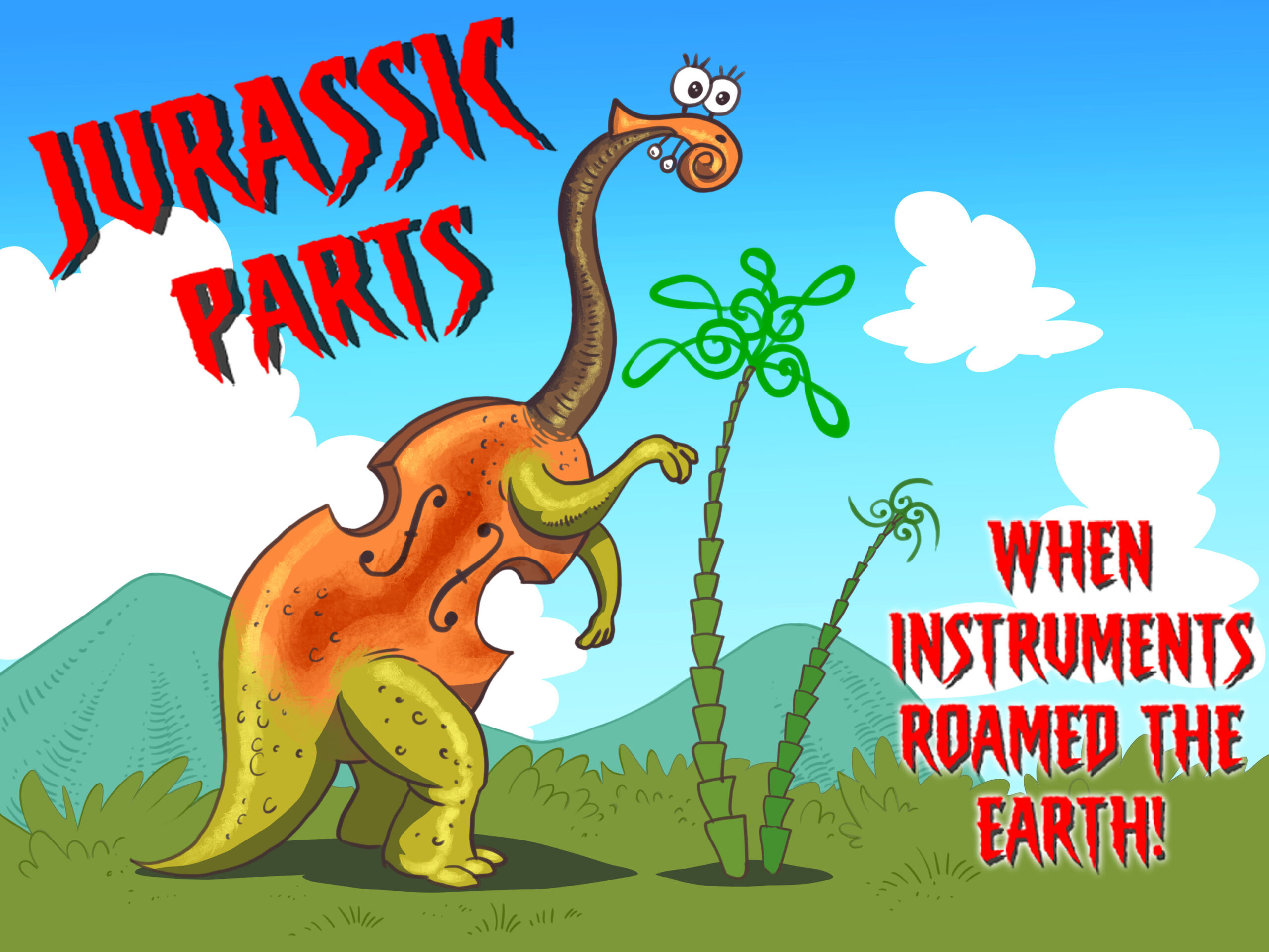 Hear the hilarious “research” of paleo-musicologist, Sir Humphrey Treble-Clef, who believes that our modern instruments are actually the descendants of giant, dinosaur-like creatures like you’ve never seen before. These are strange creatures which exist in the hot, mysterious, swampy jungles of Sir Humphrey’s unusual imagination.