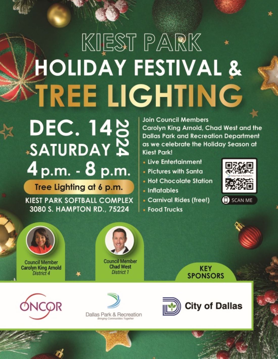 Kiest Park Holiday Festival & Tree Lighting welcomes Santa’s crafts workshop, cozy hot chocolate station, and children’s holiday-themed inflatables. Free carnival rides for all ages include rock climbing, pirate ship, choo-choo train and ballistic swings.