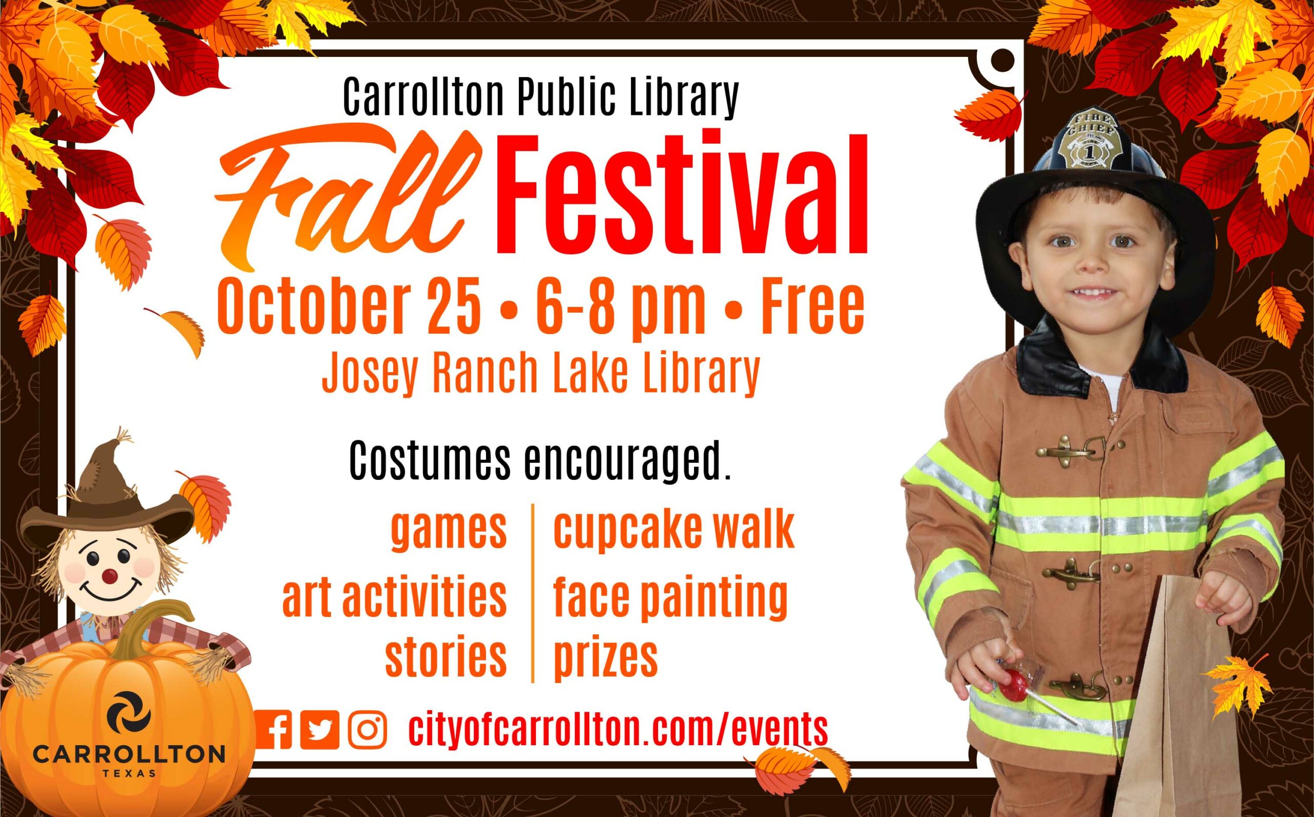 Drop in for some free, fall family fun and celebrate Halloween early at the Carrollton Public Library at Josey Ranch Lake. Enjoy games, art activities, scary stories for kids of all ages, a cupcake walk, face painting, prizes, Halloween trivia, and more. Costumes are encouraged, and remember to bring a bag for collecting treats.