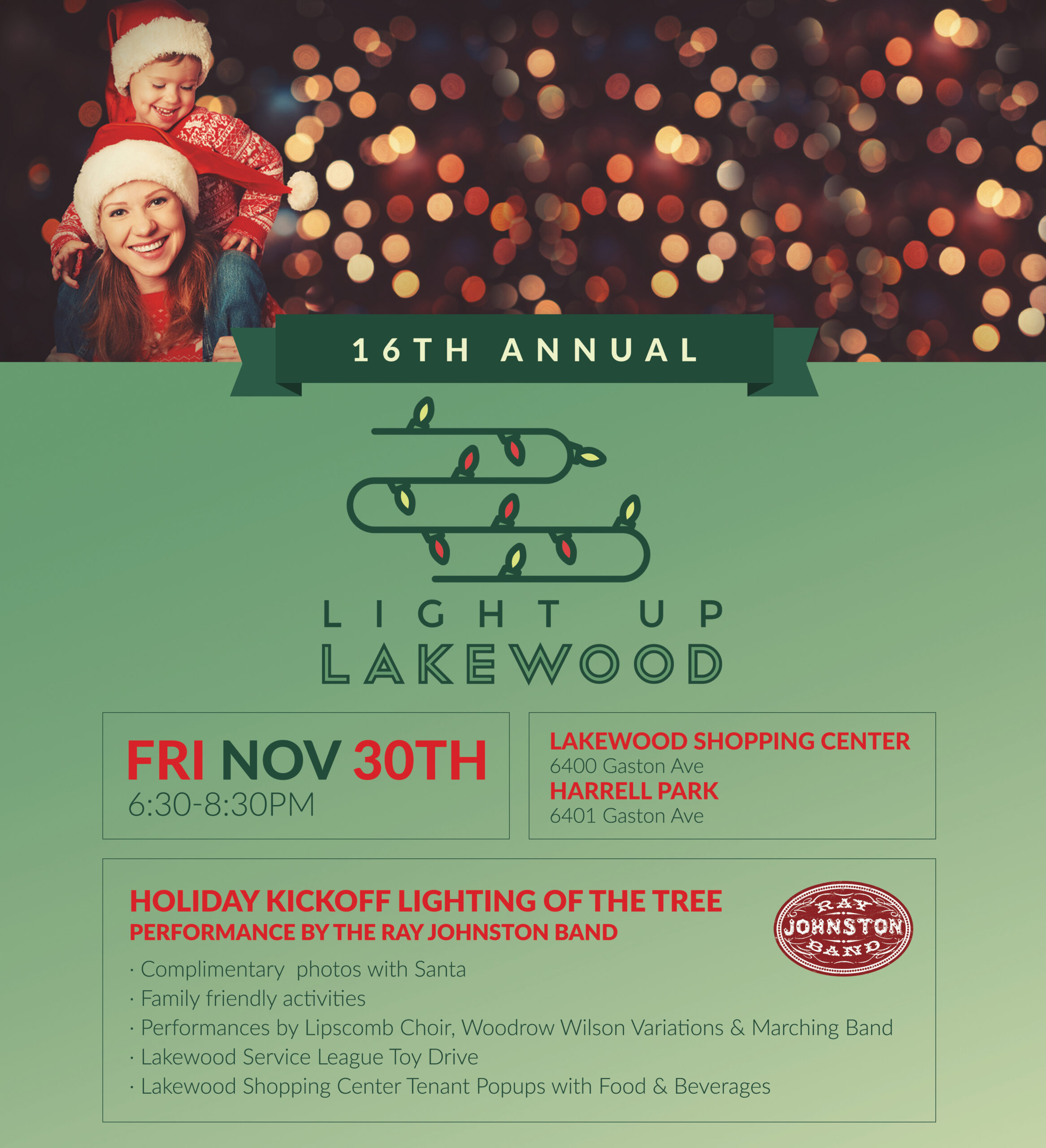 Light Up Lakewood is the 16th annual neighborhood appreciation event for the East Dallas community featuring a Christmas tree lighting, pictures with Santa, kids' activities, a Christmas movie screening, food and beverages, and performances by the Ray Johnston Band, Lipscomb Choir, Woodrow Wilson Marching Band & Variations Choir.