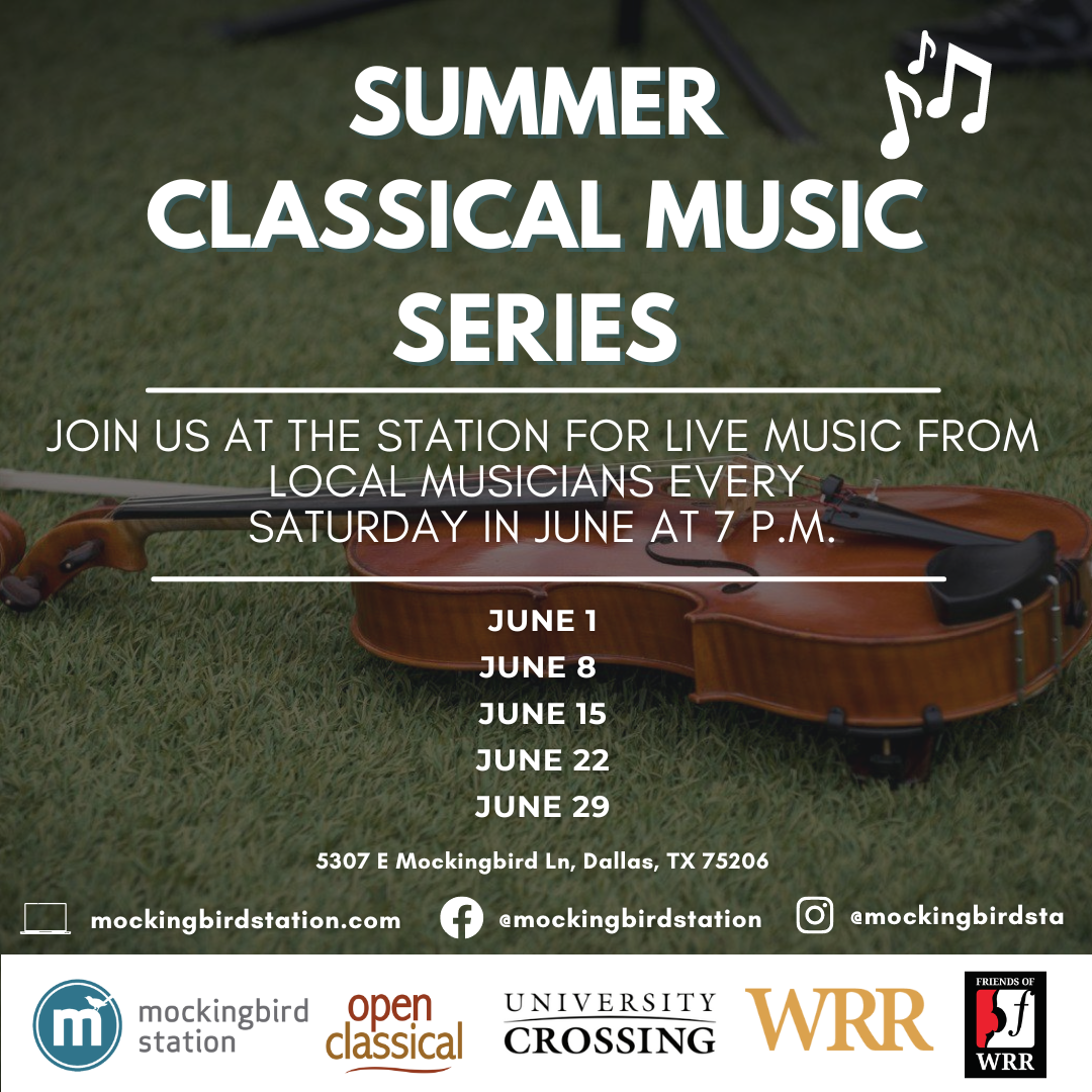 Mockingbird Station® is excited to partner with WRR Classical 101, Friends of WRR, Open Classical, KERA, and University Crossing, to present a Summer Classical Music Series. The series will bring free musical performances to the open-air amphitheater outside the Angelika Film Center every Saturday during the month of June from 7–8pm. Grab your friends and family and head over to Mockingbird Station for these one-of-a-kind musical experiences.