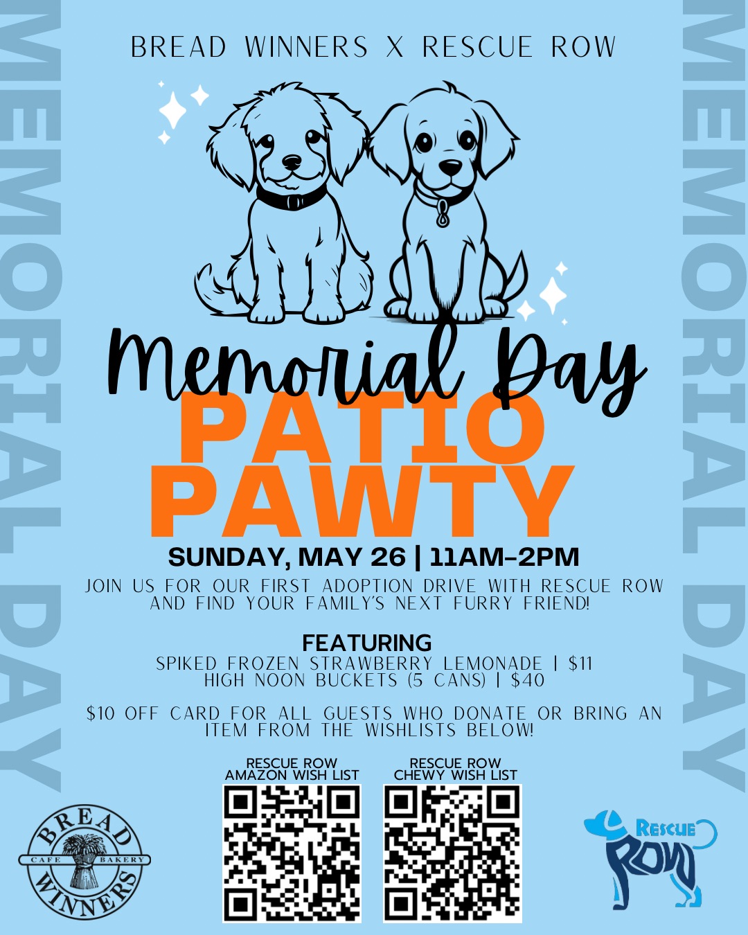 Can’t adopt but still want to make a difference? In the spirit of giving back, Bread Winners Café & Bakery encourages guests to contribute to Rescue Row's Amazon and Chewy Wish Lists. Guests who donate and provide proof of purchase will receive a $10 off card for their meal as a token of appreciation for their support. Follow Breadwinners' Facebook page for more details.