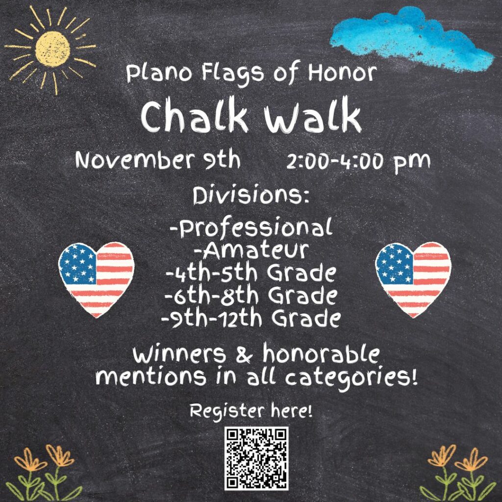 Patriotic Chalk Walk invites artists of all ages and skill levels to create patriotic-themed chalk art along the walkways at Plano Flags of Honor. This colorful community event celebrates creativity, freedom, and remembrance while honoring our nation’s heroes. Admission is free, and supplies are provided.