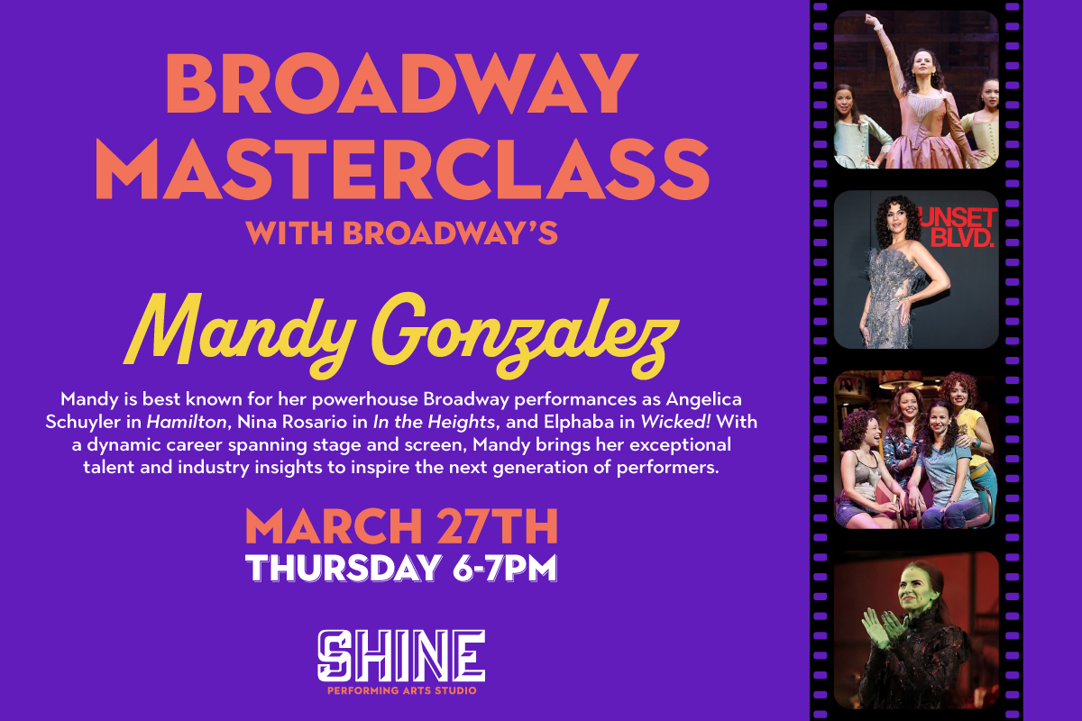 On Thursday, March 27, Shine hosts a guest for its Broadway Masterclass Series. Mandy Gonzalez is coming to Shine and we can’t wait to have the students coach their pieces with her!
