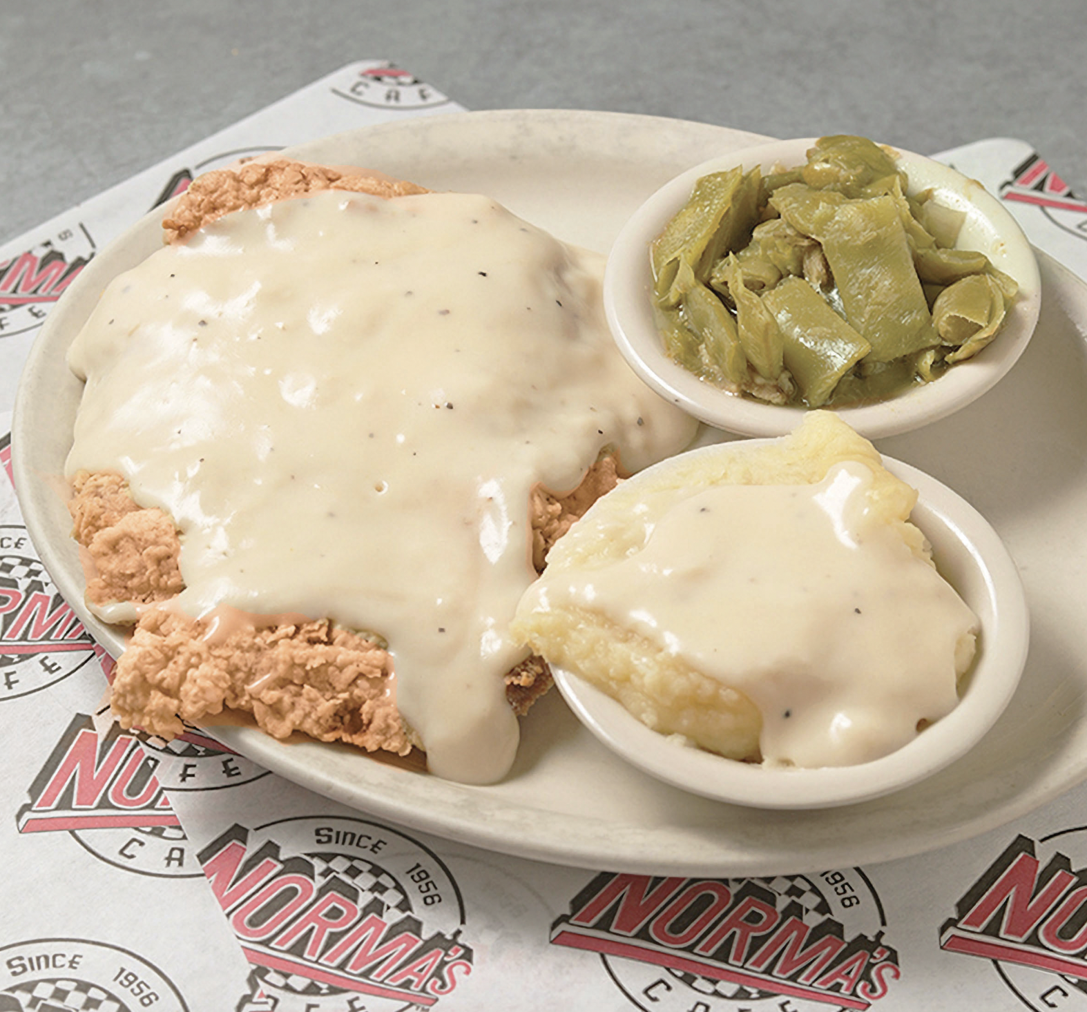 The meal includes chicken fried steak and gravy with mashed potatoes and our famous green beans with rolls/cornbread. Available dine-in at these Norma's Cafe locations: