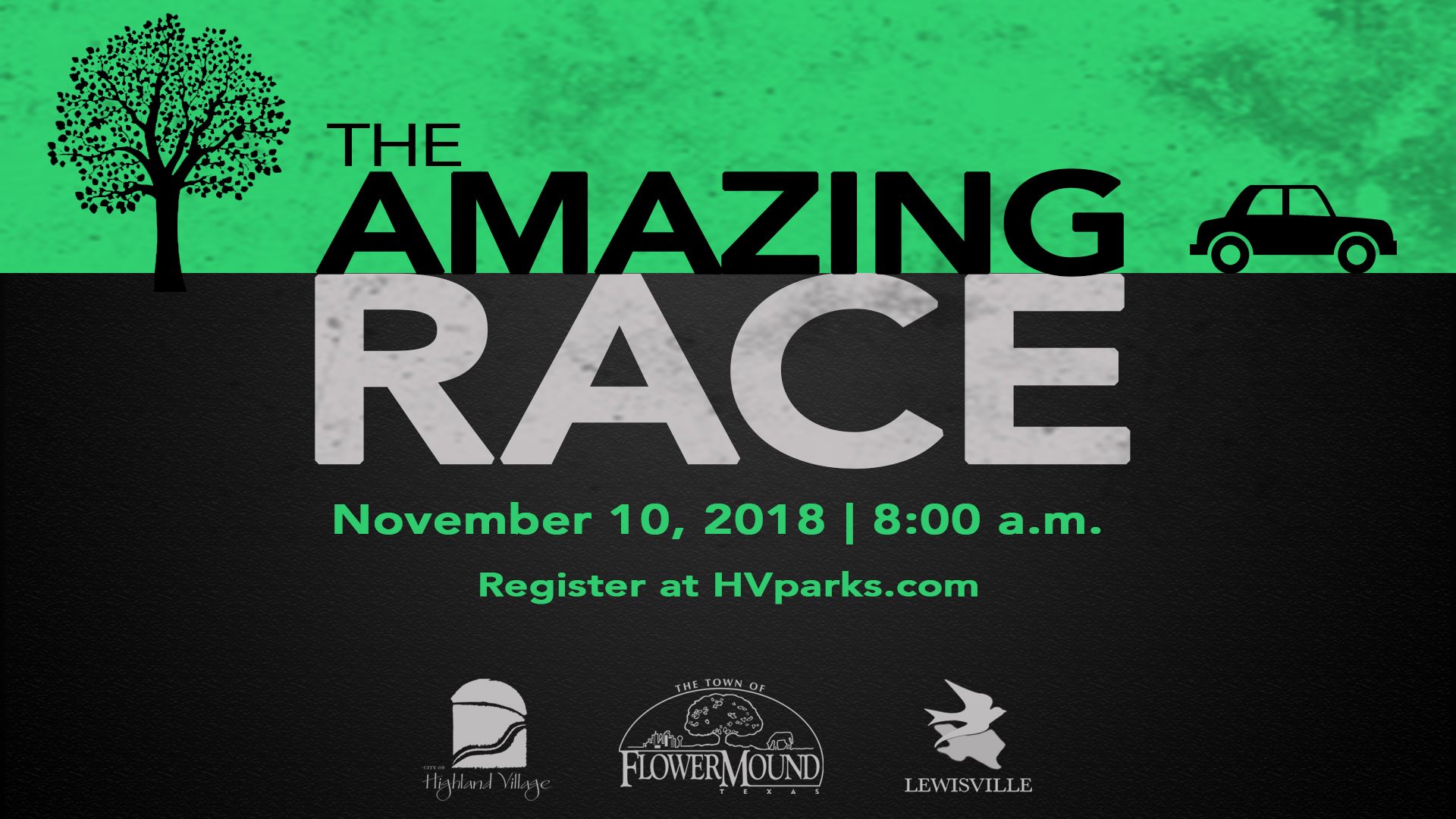 Come out and join the City of Highland Village Parks and Recreation for its inaugural Tri-Town Amazing Race. Be prepared to get a little dirty and wet as you complete challenges at 10 pit-stops throughout Flower Mound, Highland Village and Lewisville.