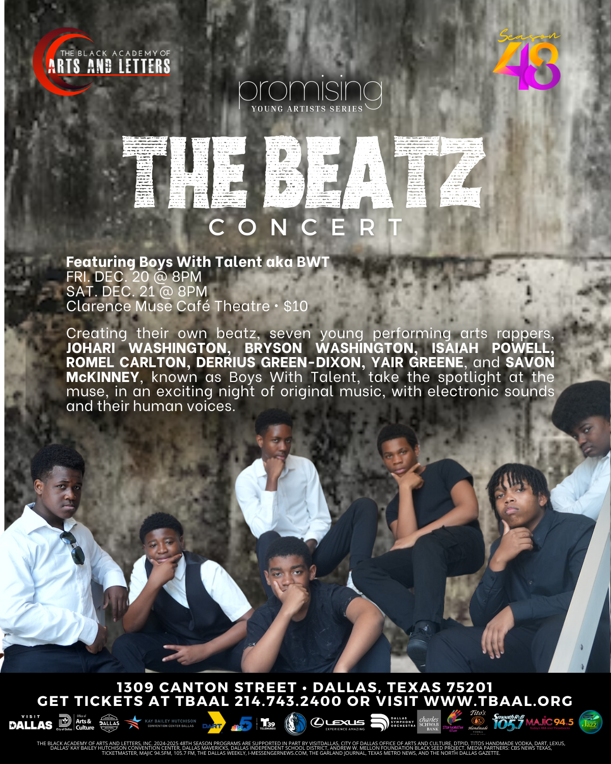 The Black Academy of Arts and Letters presents The Beatz Concert! This promising young artists series will feature seven young performing arts rappers known as Boys With Talent. Seven young performing artist rappers, from the public and private schools, create their own beat and take the spotlight at TBAAL for an exciting night of original music, electronic sounds, and their human voices.