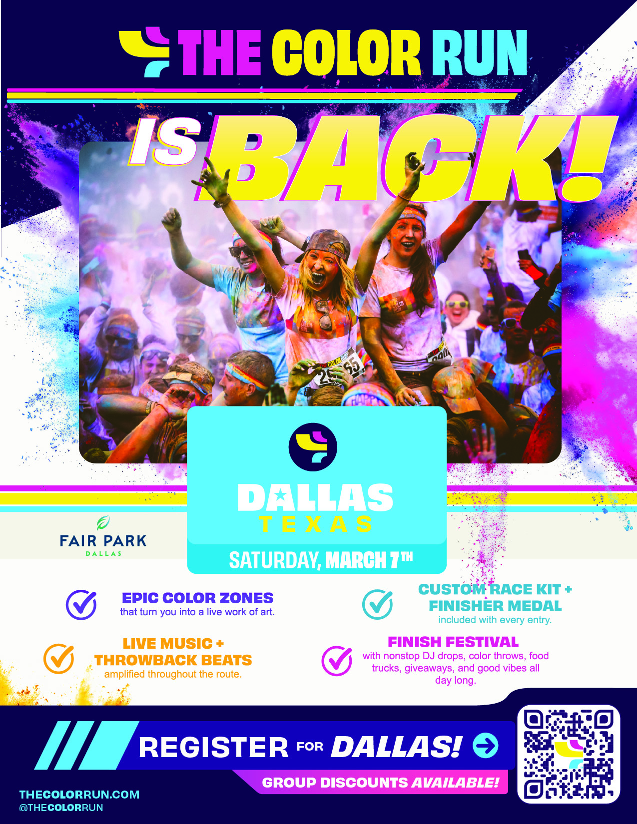 The Color Run is back in Dallas – energized, amplified, and more vibrant than ever. Get ready for a 5K bursting with color, music, and pure celebration. Come for the run, stay for the party that runs on good vibes. Registration includes powder packet for the color throw.