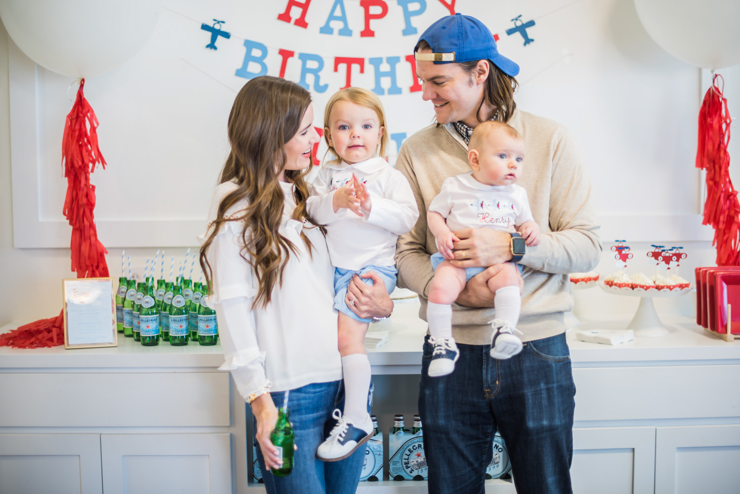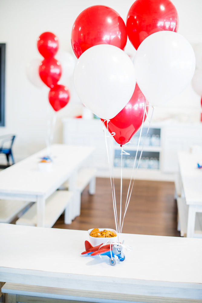 No detail was left up in the air: Stia sourced boarding passes—er, invitations—and custom red, navy and light blue decorations from Etsy and local indie retailers. More than 50 friends and family were welcomed into the birthday bash by a handmade banner and large cloud-like white balloons accessorized with tassels and tied to wooden aircraft. William and younger brother, Henry, were clad in airplane-embroidered outfits before the birthday boy switched into a mini pilot uniform to soar around the play areas with his 12 high-flying friends.