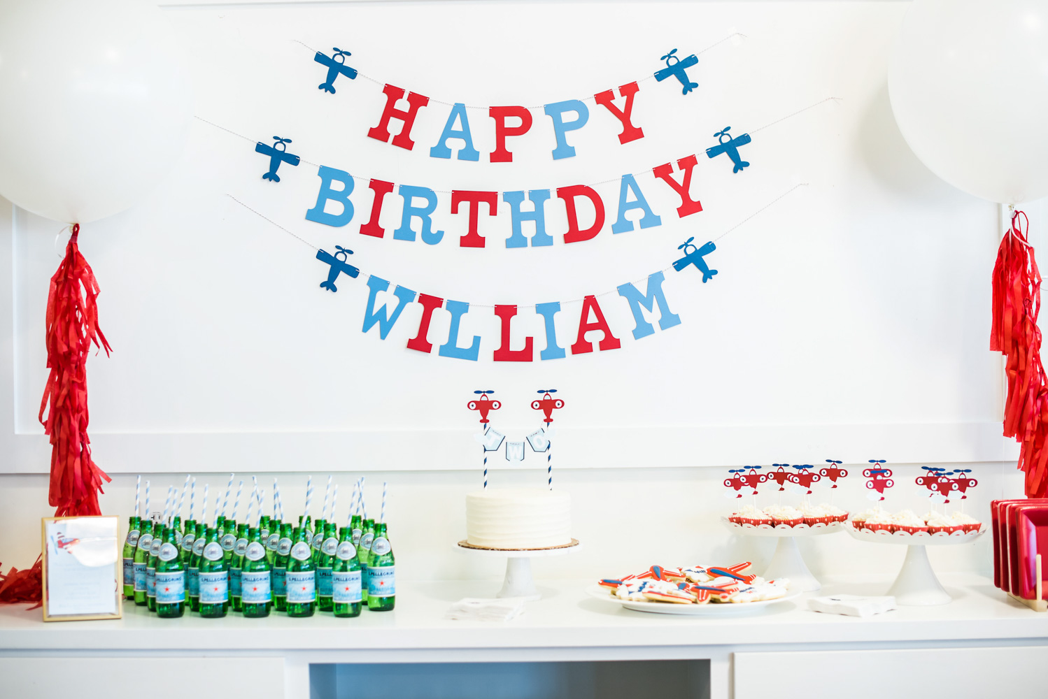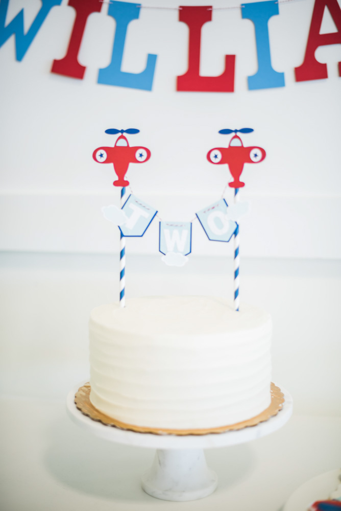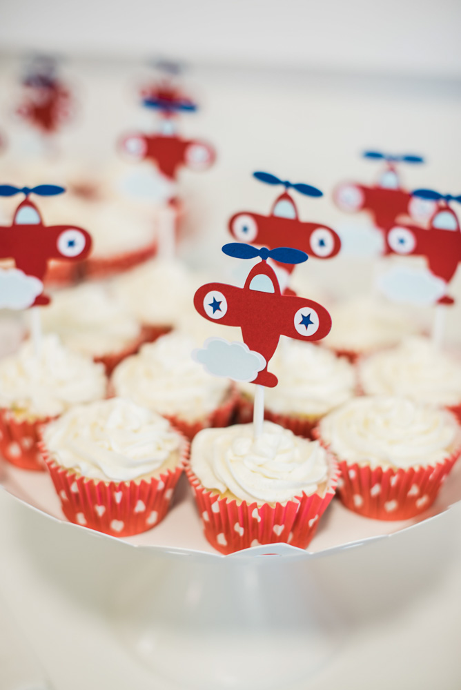 In-flight refreshments included William’s favorites: pretzel thins and sparkling water. Guests also munched on airplane-shaped sugar cookies, homemade Funfetti cupcakes and a vanilla cake topped with aviation-themed decorations.