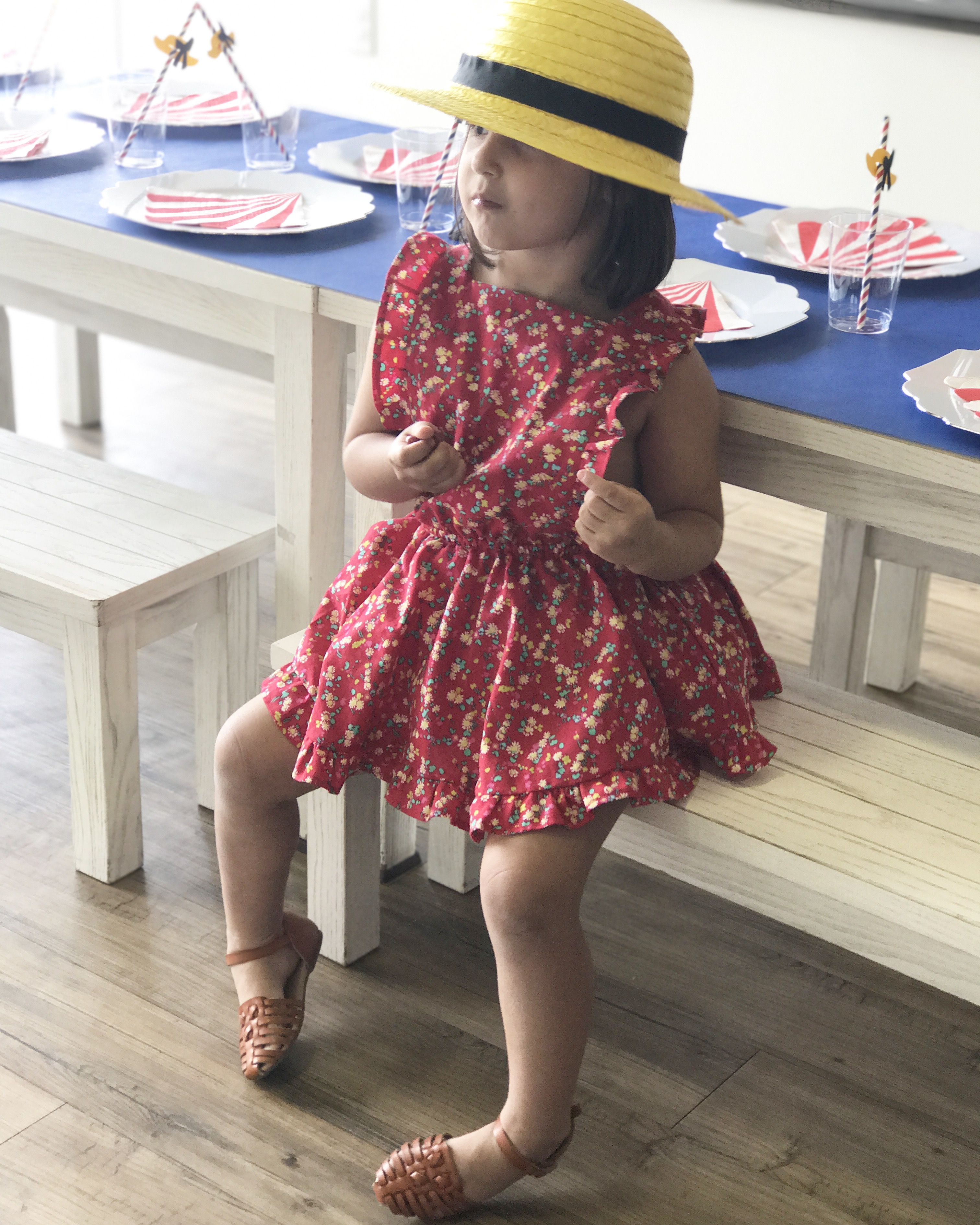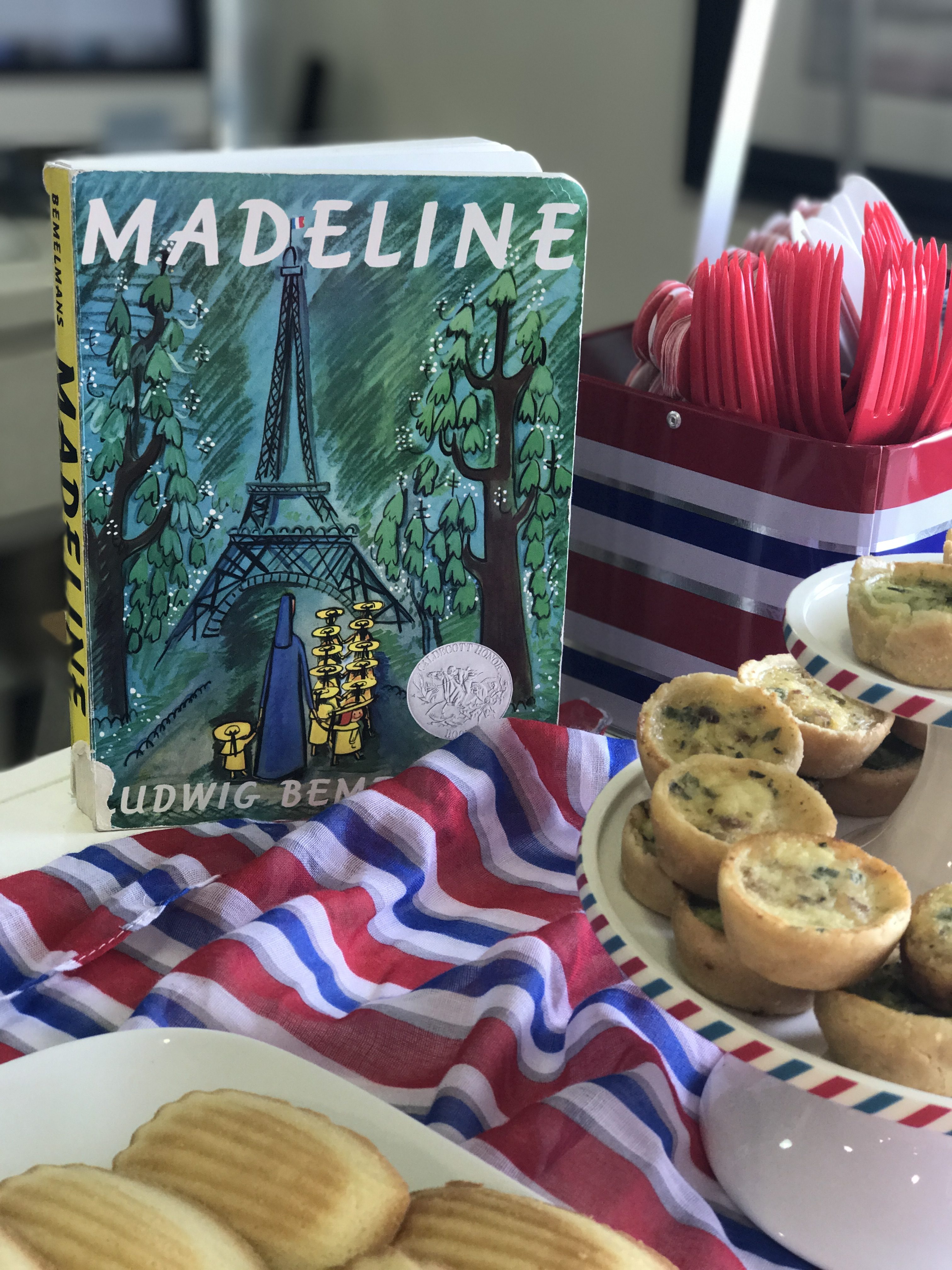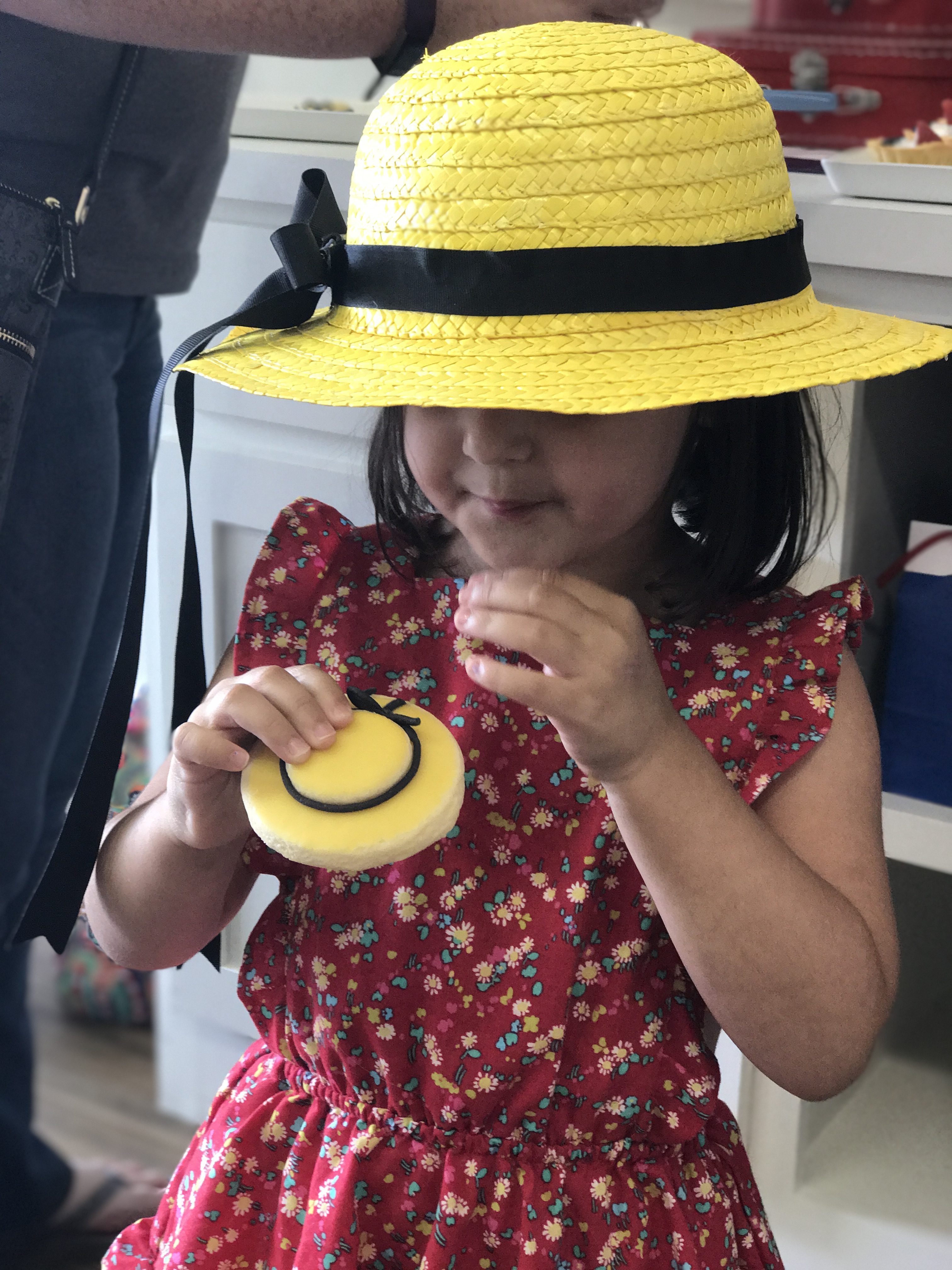 After romping around the playhouses, Nona’s dozen guests dined on baguettes, quiche, madeleines and mini homemade sugar cookies shaped like Madeline’s hat. Crumbs were captured by delicate red and white scalloped napkins. Nona and her mom said “Merci!” with collared party favor bags filled with Madeline-themed coloring books, fruit snacks and crayons shaped like the Eiffel Tower. Red ribbons tied it all together. Oh, and they didn’t forget the hats!