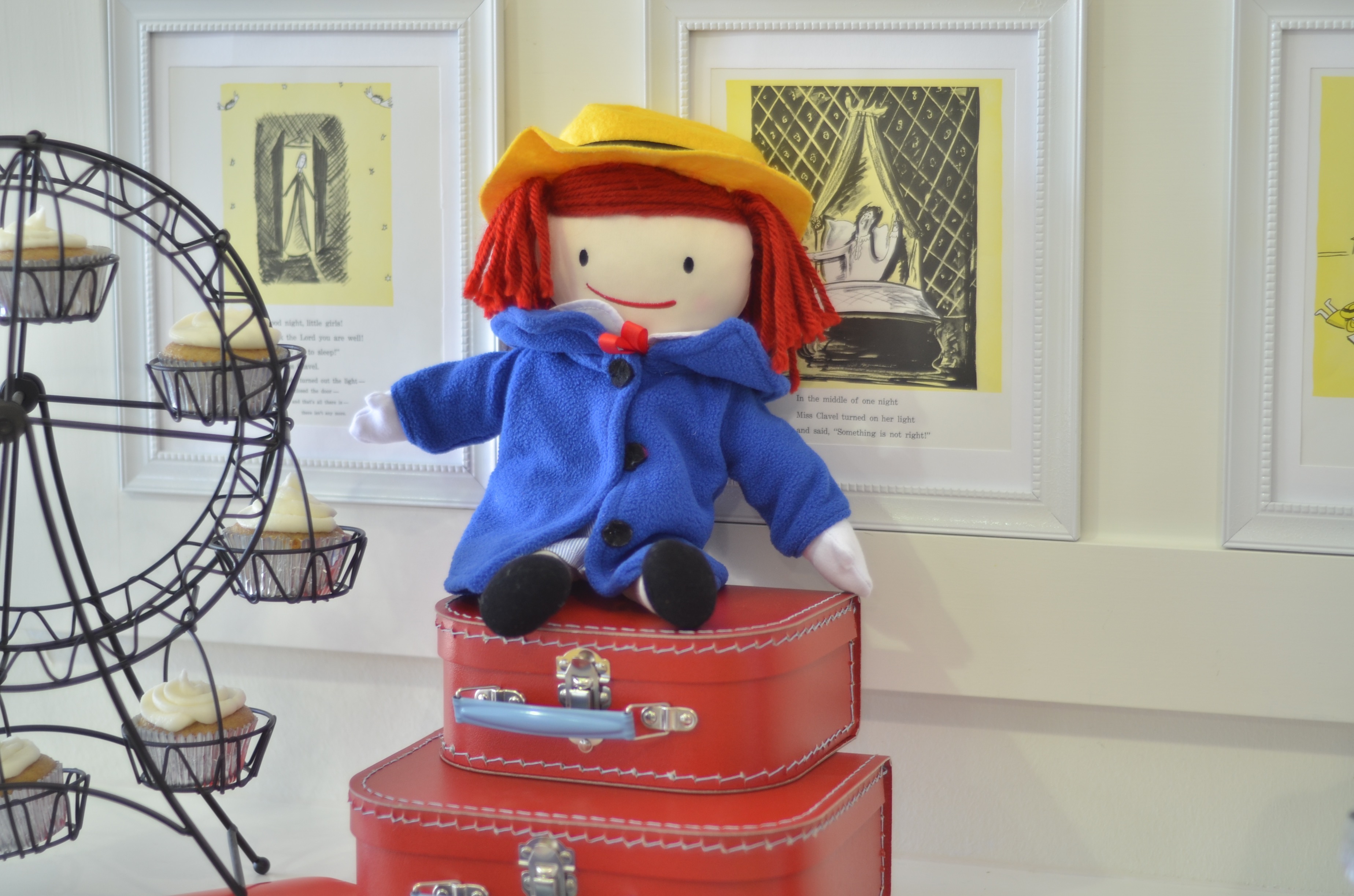 Every detail gracefully combined the books’ monochromatic color palette, Parisian collar motif and snippets from Nona’s favorite stories: The ferris wheel from Madeline and the Gypsies, the luggage from Madeline Goes to London, framed pages from Madeline the original and, of course, the character’s quintessential yellow straw hat, which inspired the birthday cake made by Delicious Cakes! in Addison. Also adorning the table were homemade French toast cupcakes and French flag fruit tarts from Deb’s Bakery.
