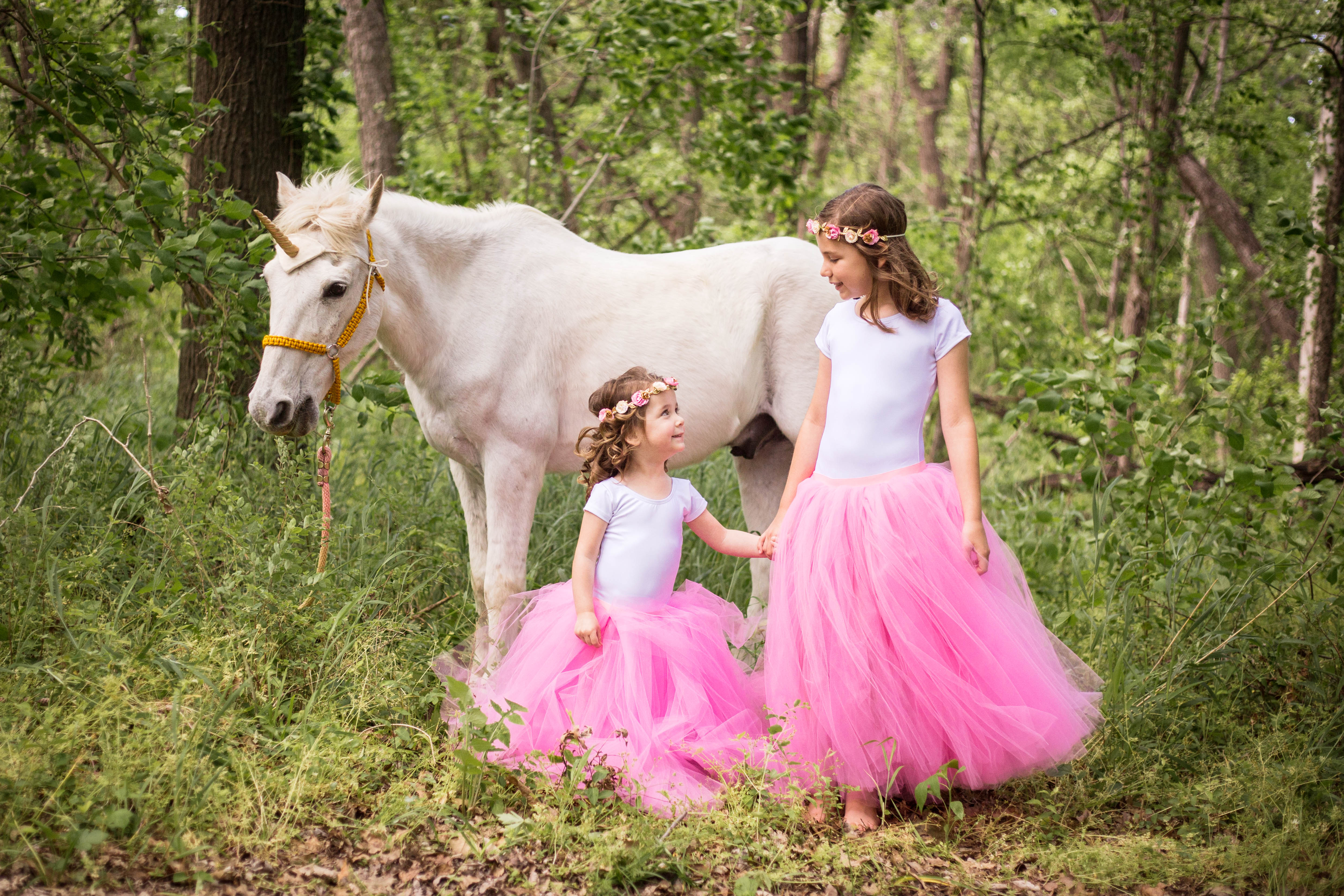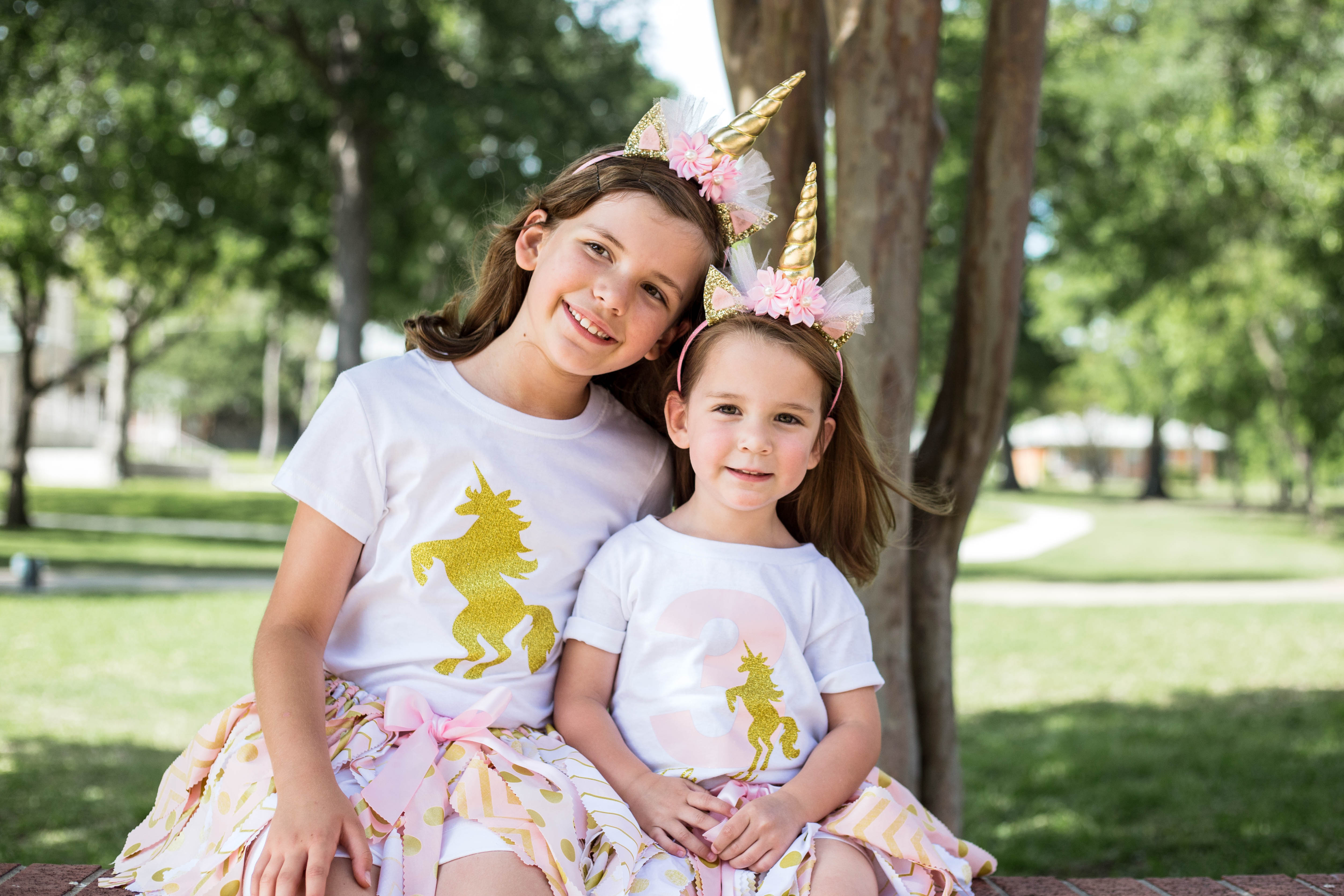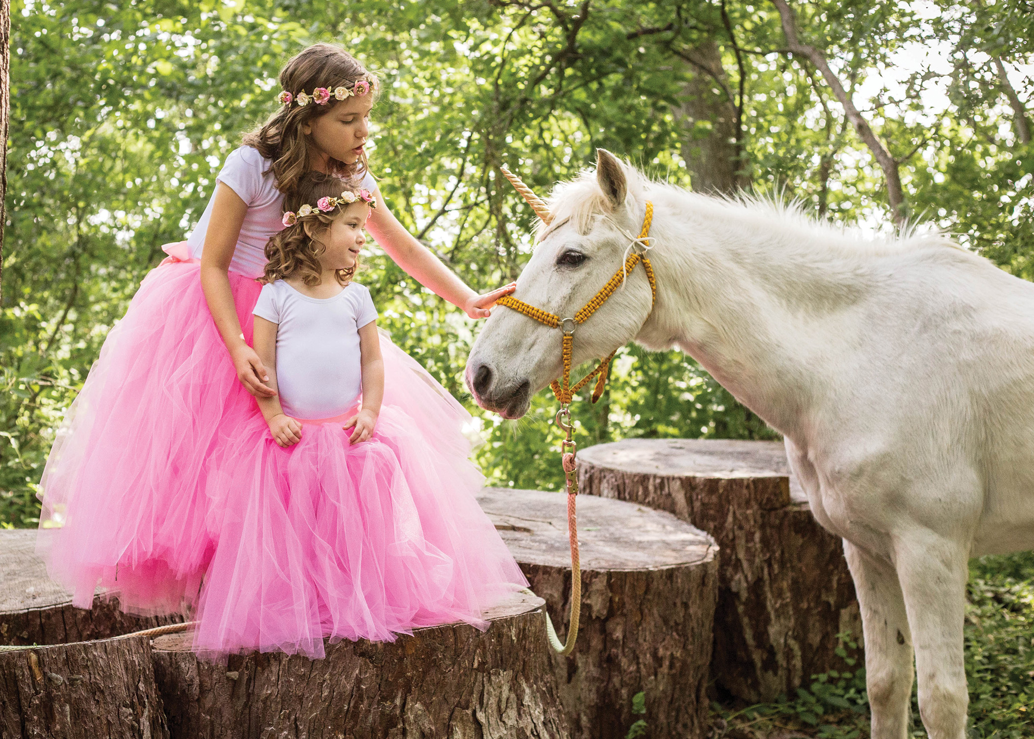 Party Time Texas supplied the goldenhorned pony (er, unicorn) for the outdoor bash in Plano. Dayna sourced additional unicorn decor and fairy princess finery from independent retailers on Etsy. Elyana and her older sister, 9-year-old Olivia, donned pink tulle skirts from Ruffles and Tutus and flower crowns by Isabella’s Boutique and greeted guests while on horseback.