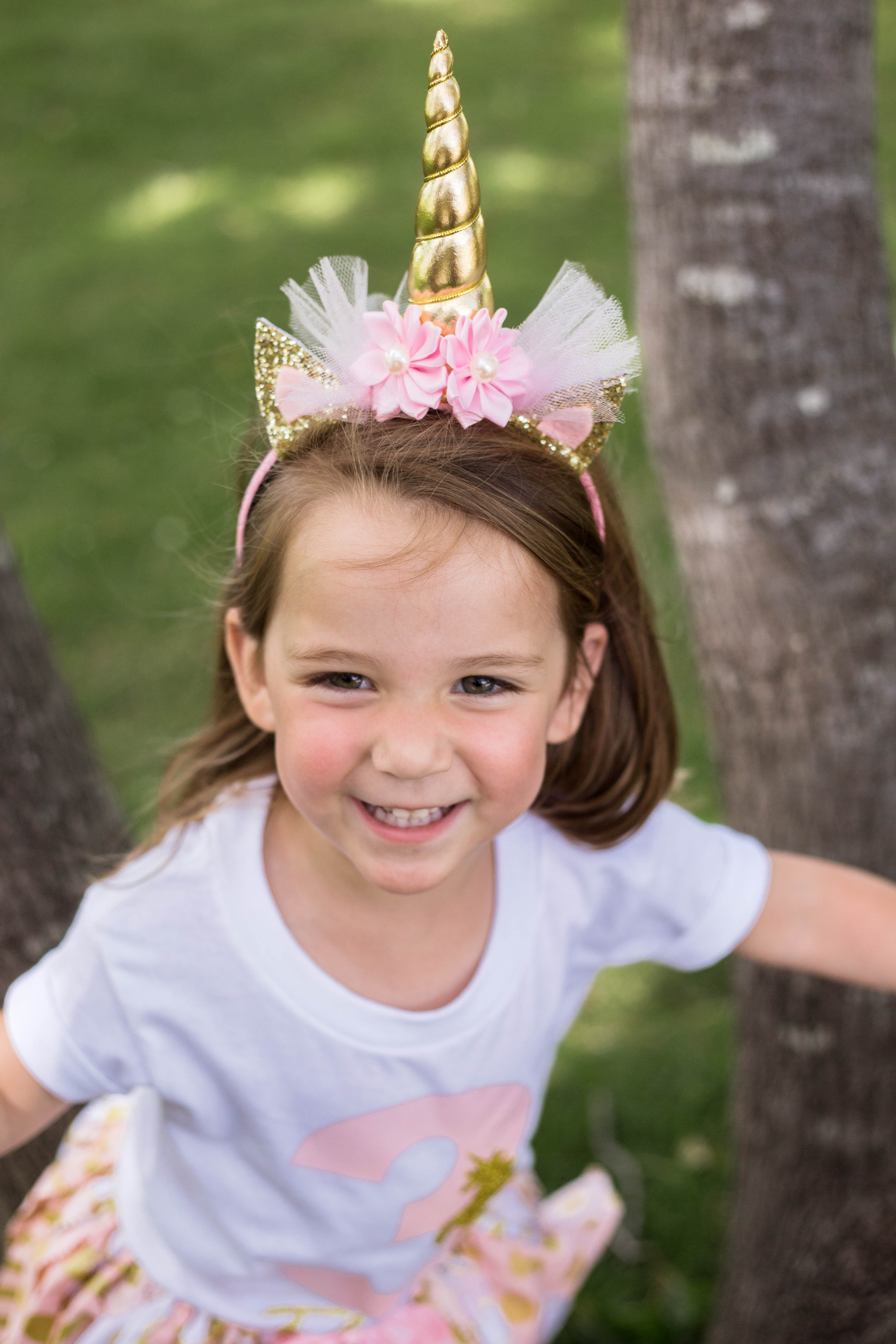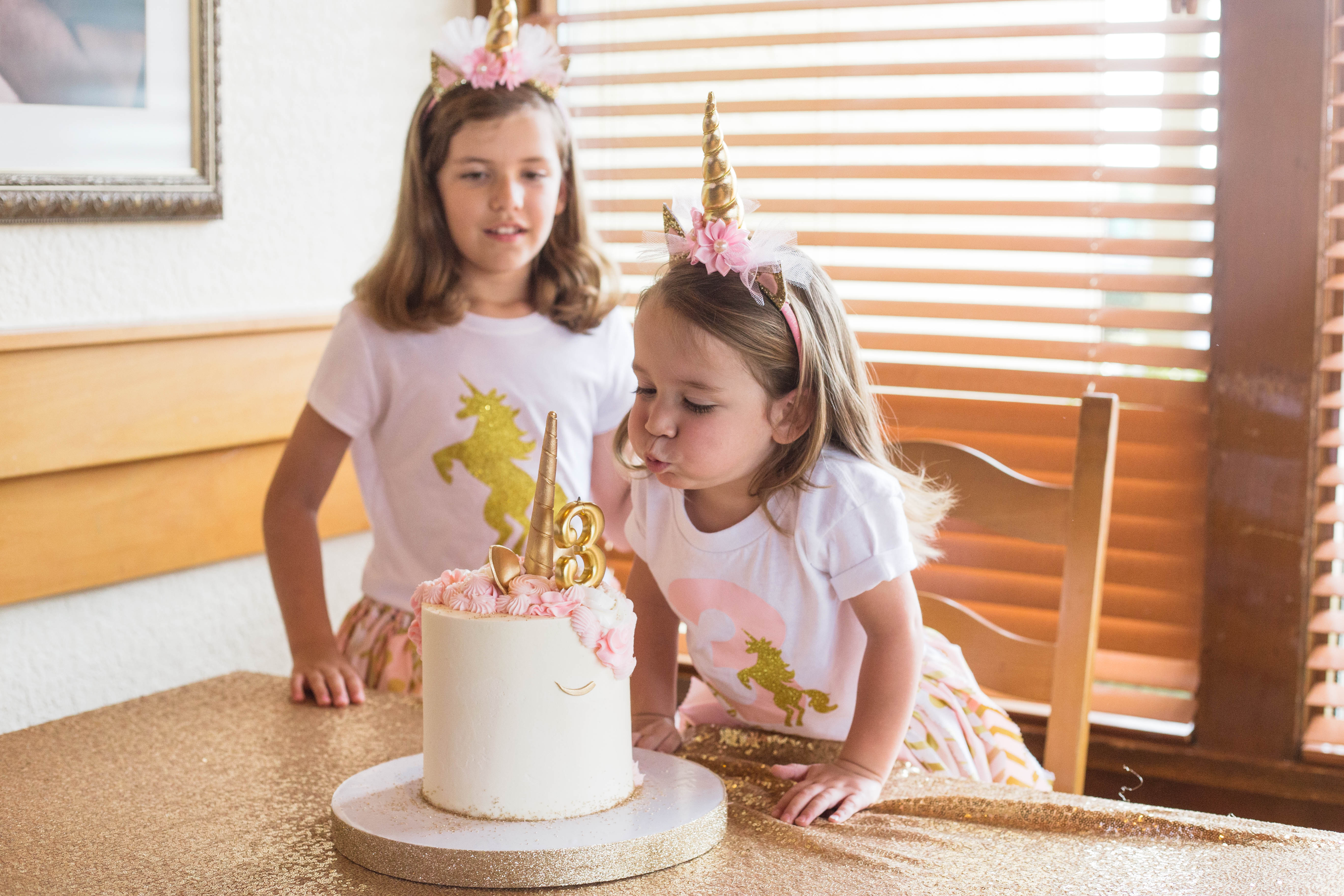 After the dozen or so guests visited with the magical four-legged creature, the festivities moved indoors—signaling Elyana’s outfit change. The birthday girl dressed the part for the magical day, opting for a pink-and-gold skirt and matching T-shirt with a gold glitter unicorn and the number three emblazoned in light pink. She and her guests also donned similarly hued unicorn headbands from Kenzee’s Kloset.