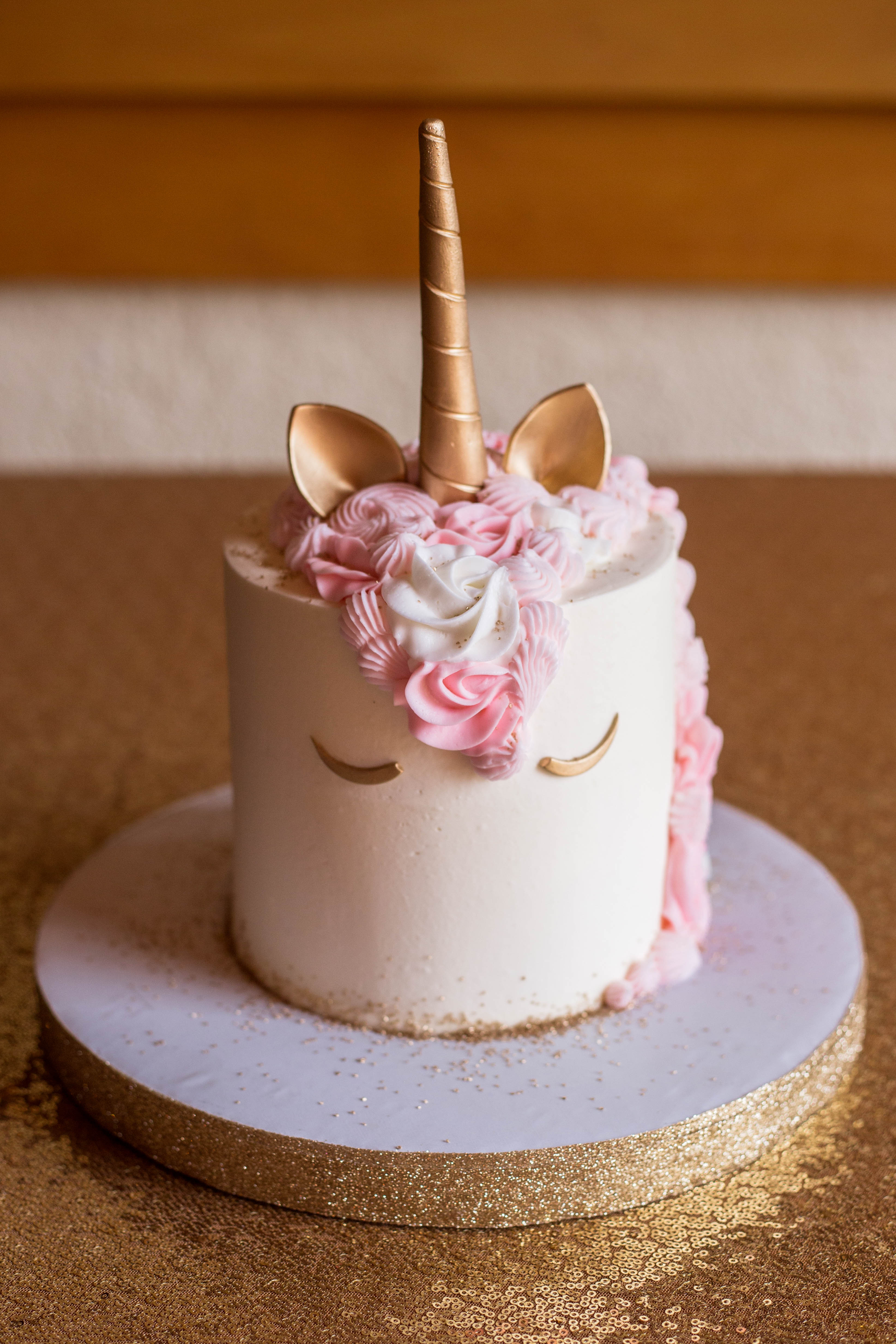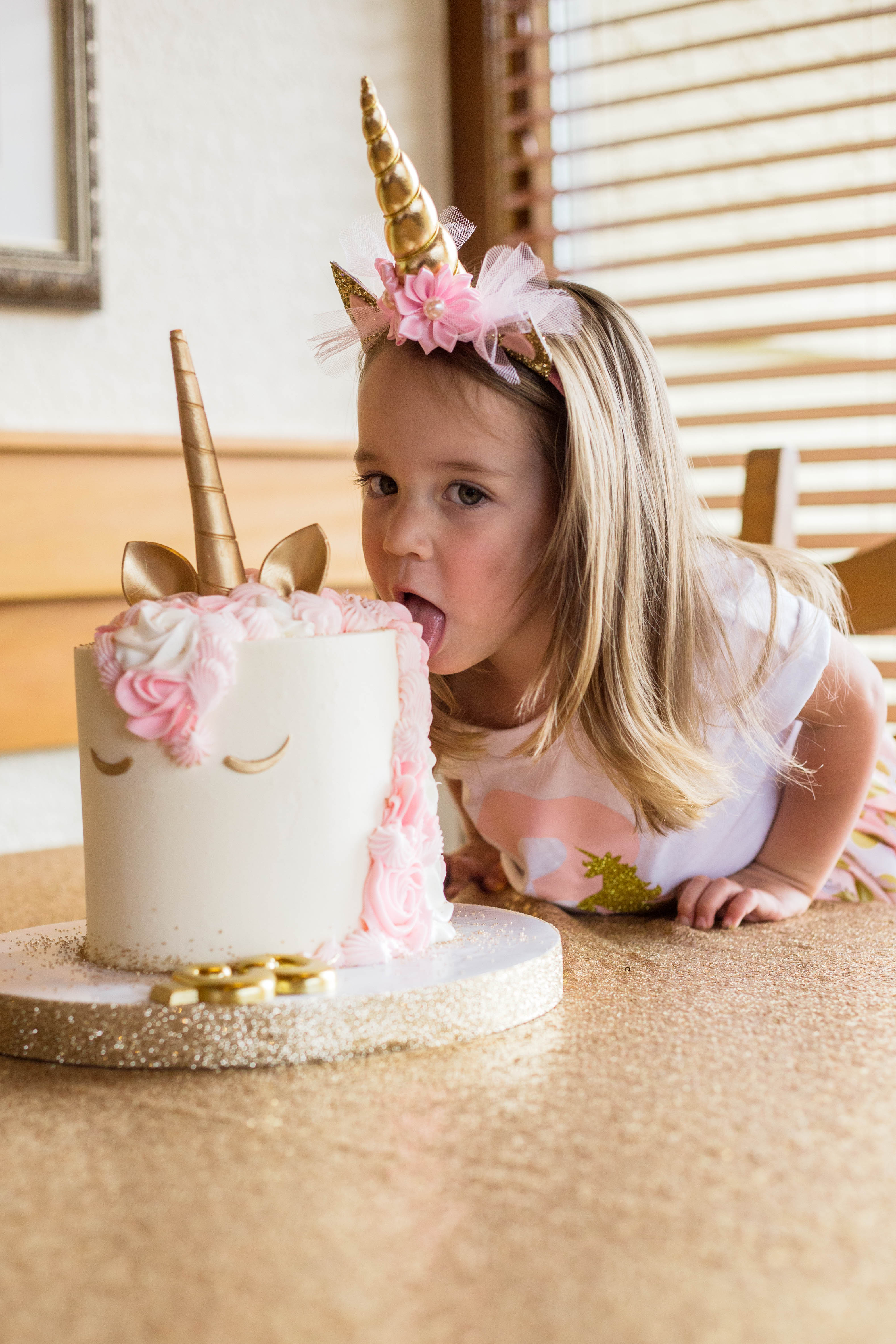 At the end of the day, the crew enjoyed a family-style dinner at Olive Garden (Elyana’s favorite), which gave Dayna the gift of very little cleanup from her professional-grade party. But before dinner, Elyana managed to dig into her birthday cake: dark chocolate with raspberry filling, decorated in pinks and gold with—of course—a gold horn.