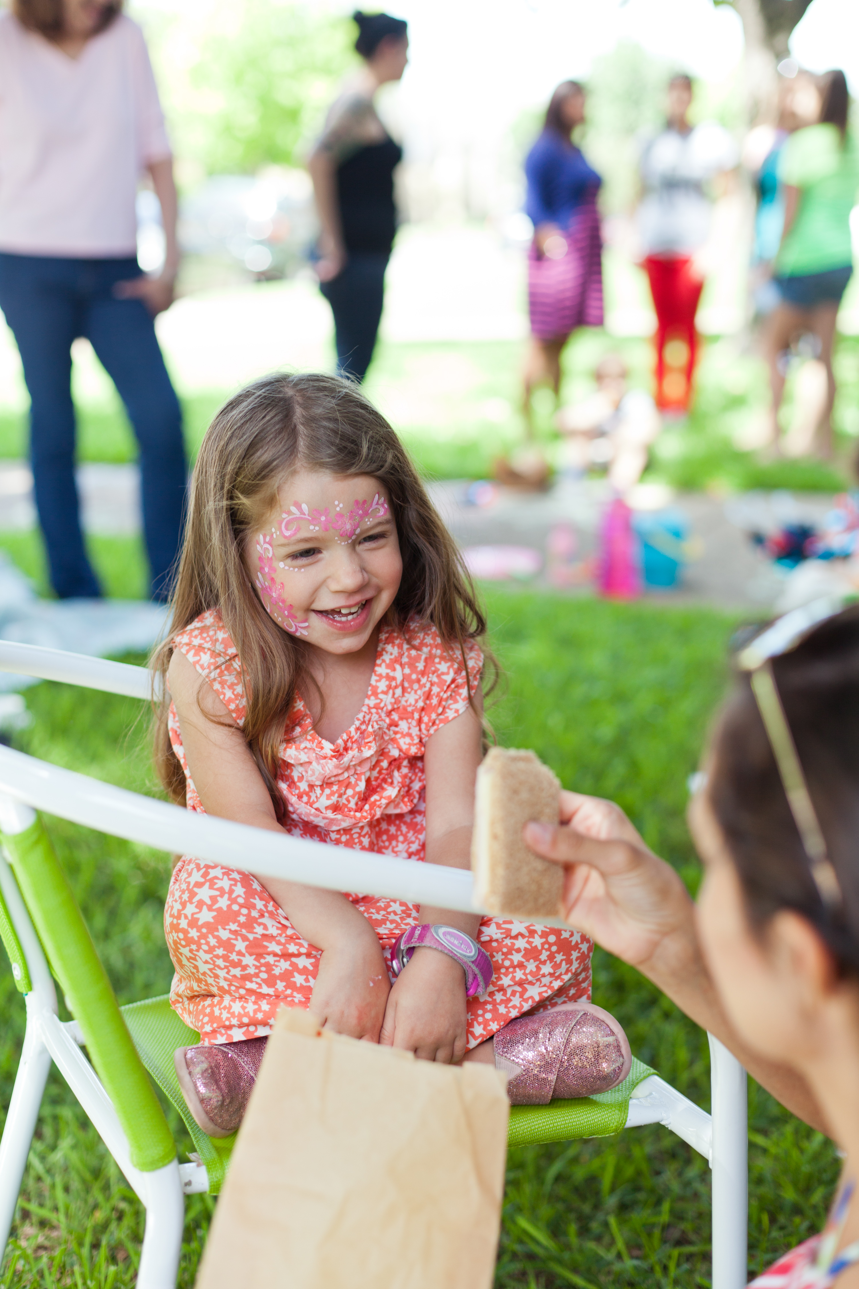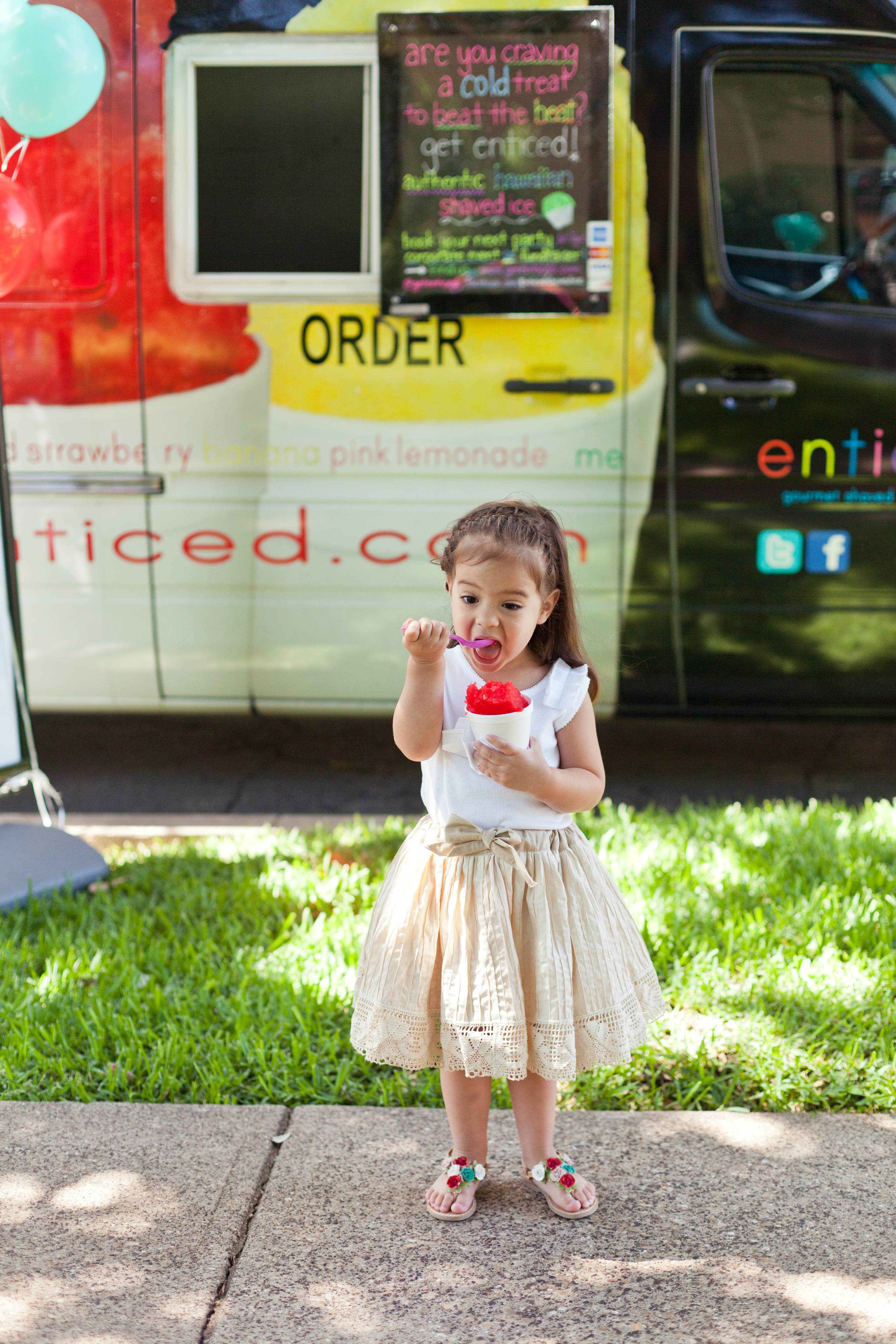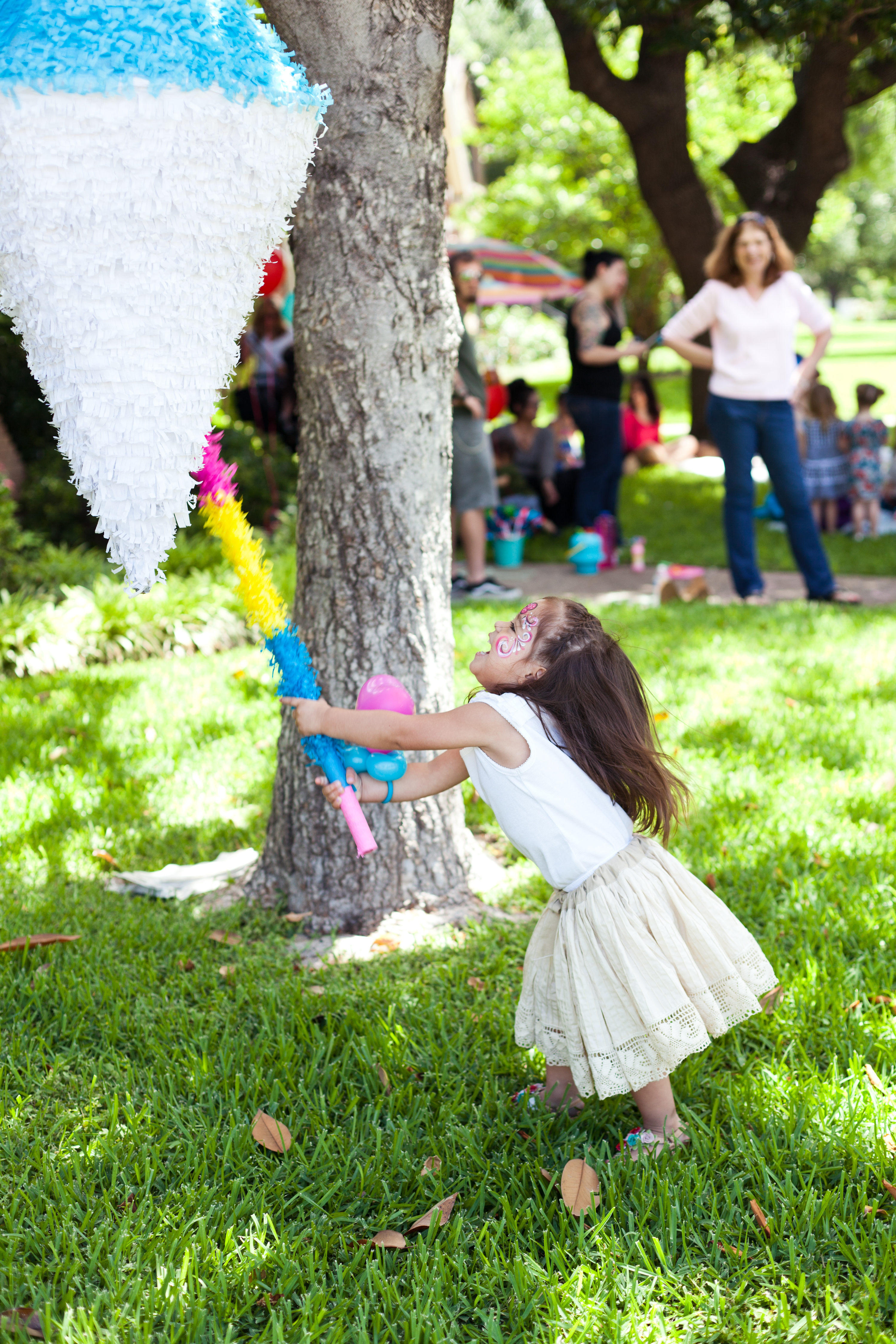 Hilda’s vision came to life when, on the day of the party, guests lounged on quilts (miniature lawn chairs for the pint-sized attendees) and kids decorated the sidewalk with chalk art, blew bubbles and swung at a piñata, filled with toothbrushes, stickers and, of course, pieces of candy. When Sophia and friends weren’t busy doodling and having at the custom-made snow cone piñata, they had their faces painted, ordered up balloon animals and enjoyed real snow cones, courtesy of the Enticed Shaved Ice truck. “Everyone there, from the littlest baby to the grandma, loved the snow cones,” Hilda says.