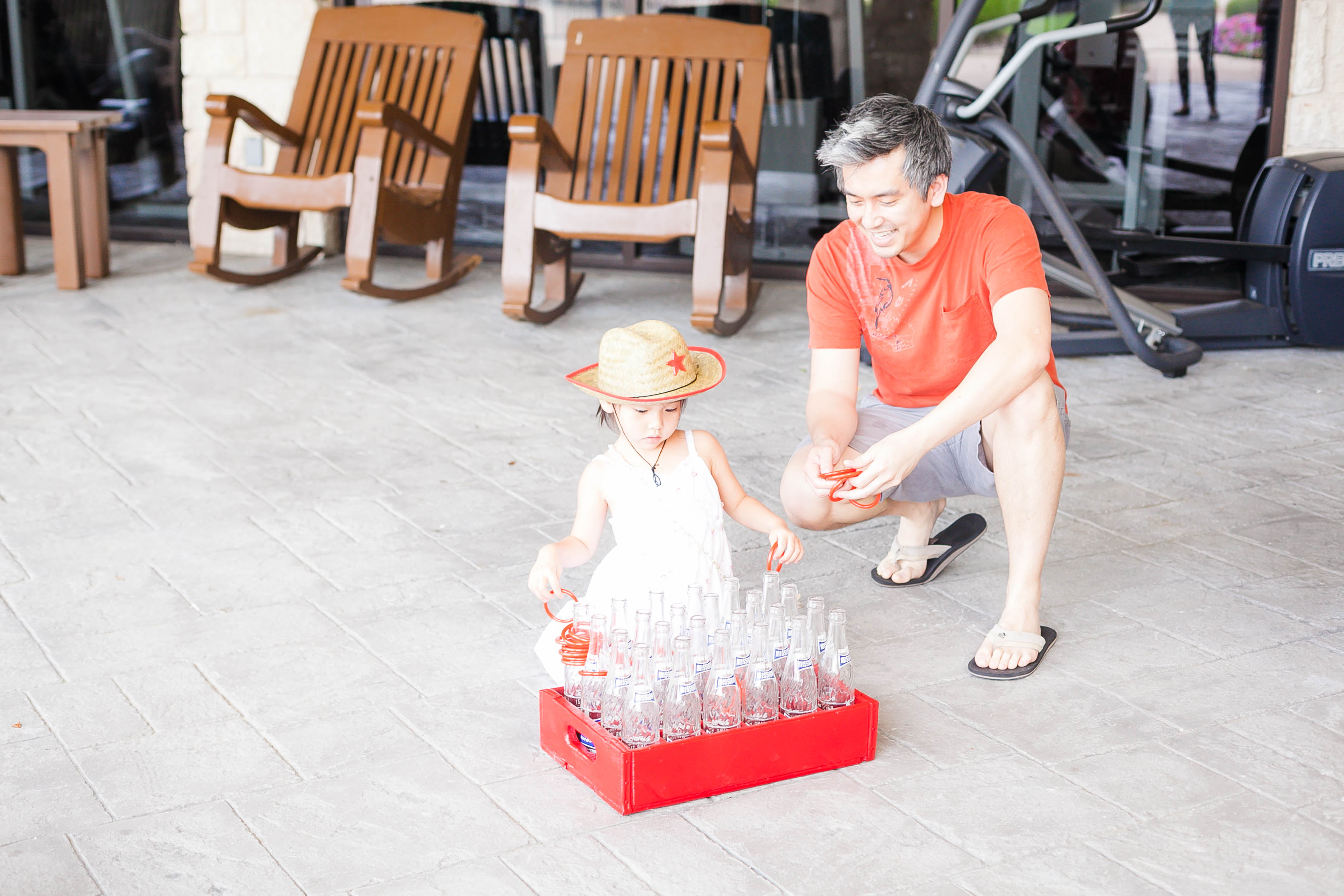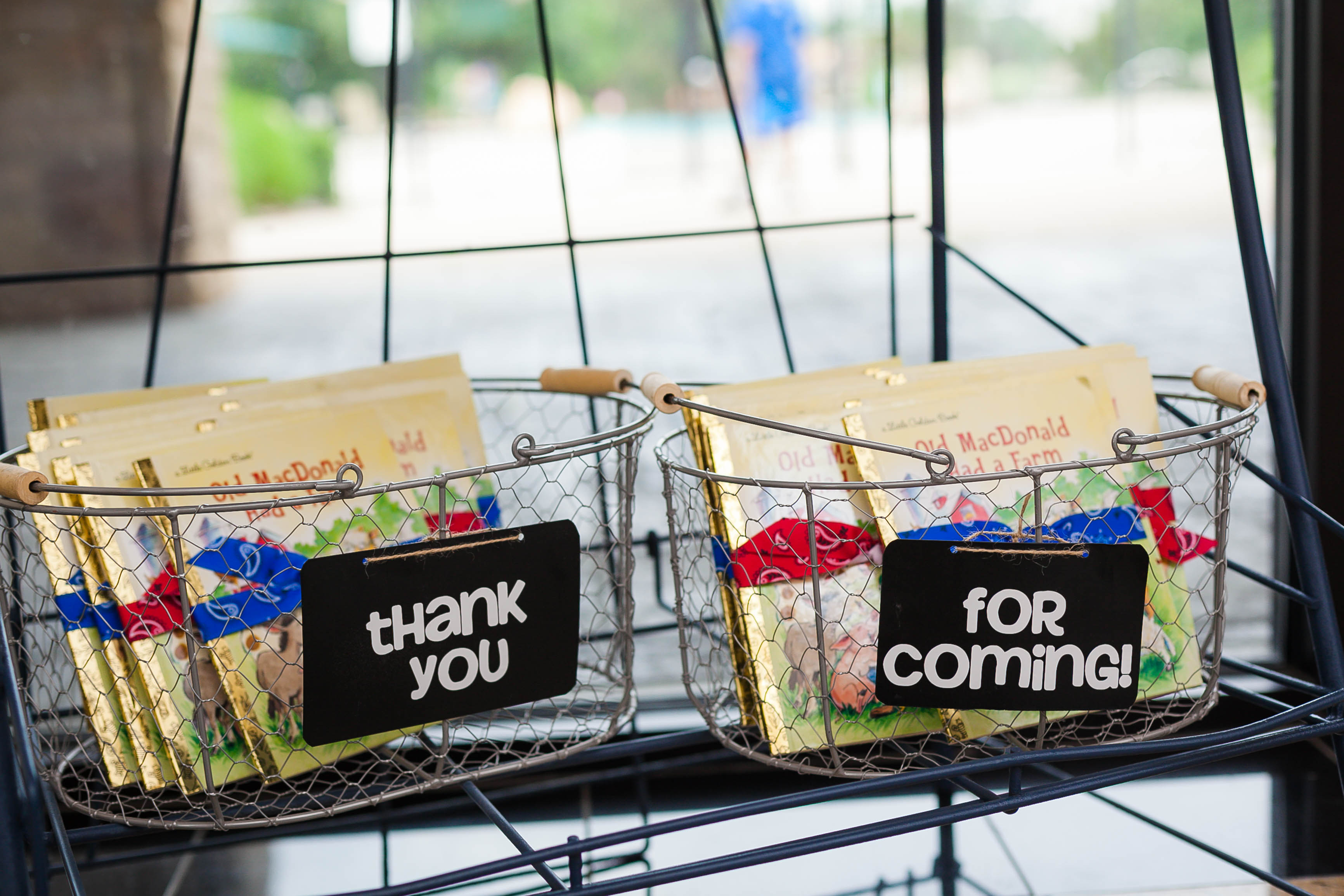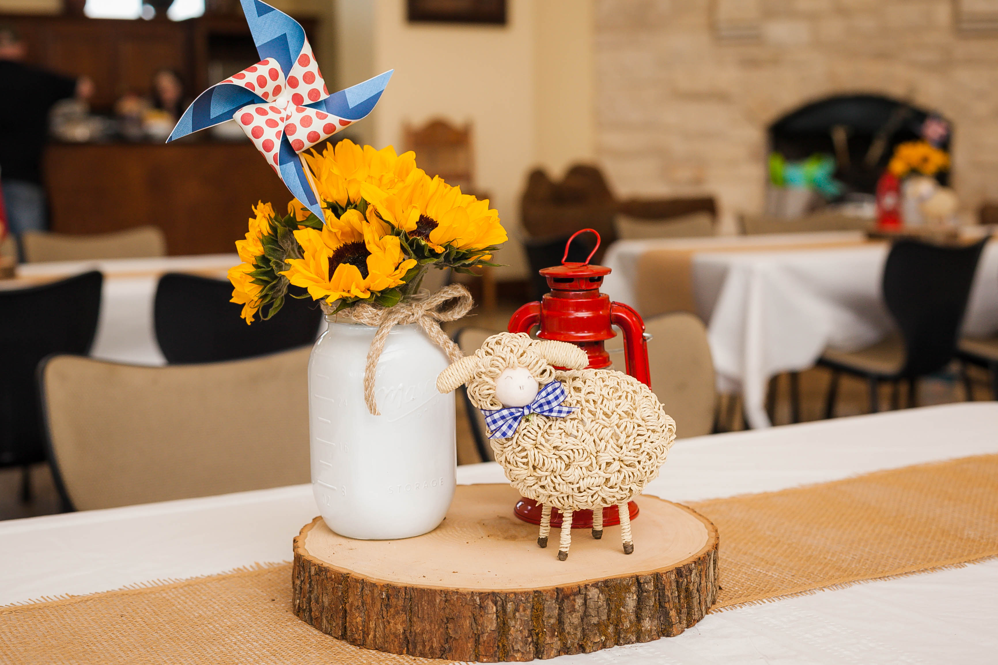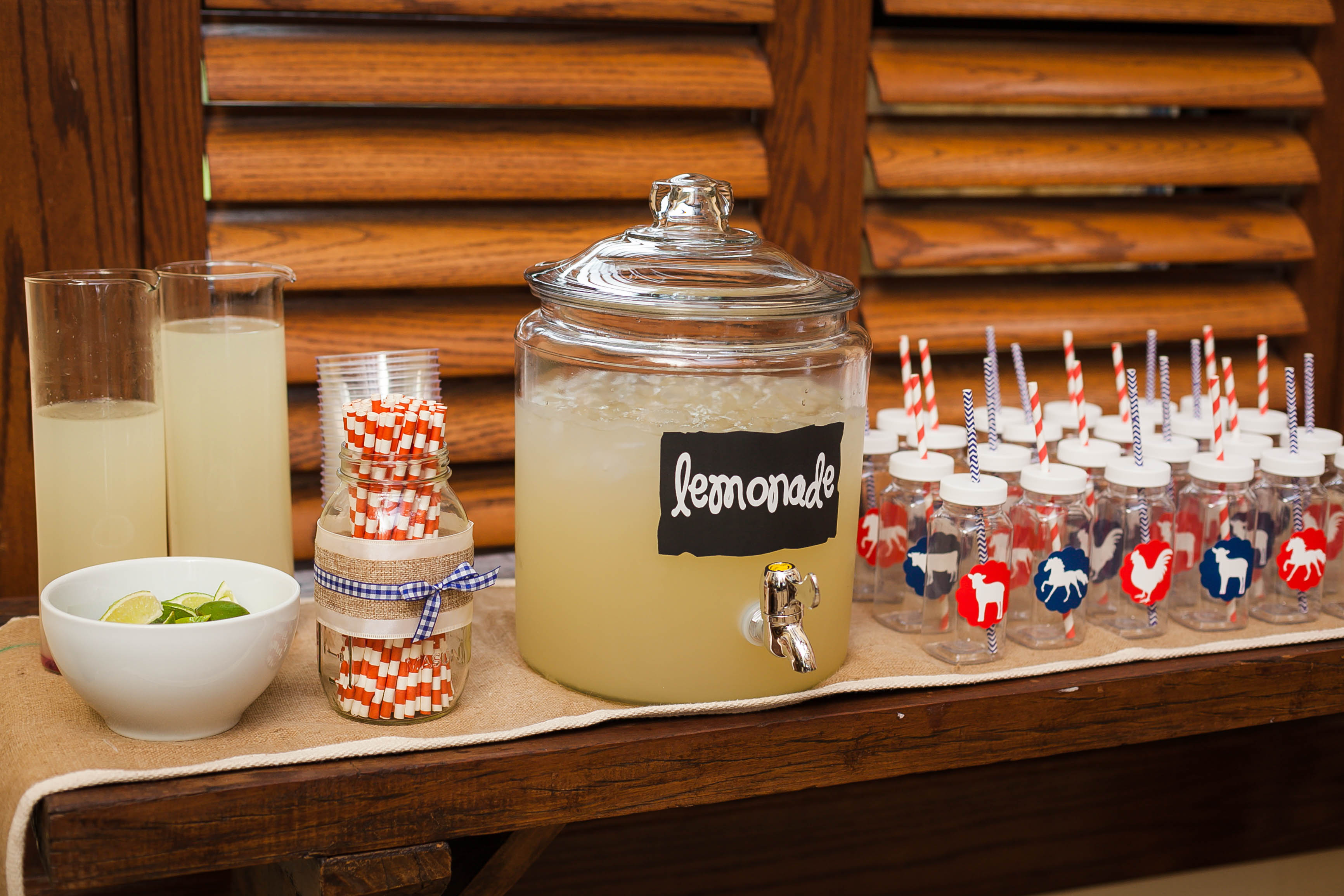 To keep the farm scene “classic but modern,” Berkley Berry of Parties on the Porch mixed white porcelain animals from HomeGoods with more rustic elements like sunflowers, wooden crates and vintage glass bottles, including an old-fashioned ring toss game to entertain the littlest guests.