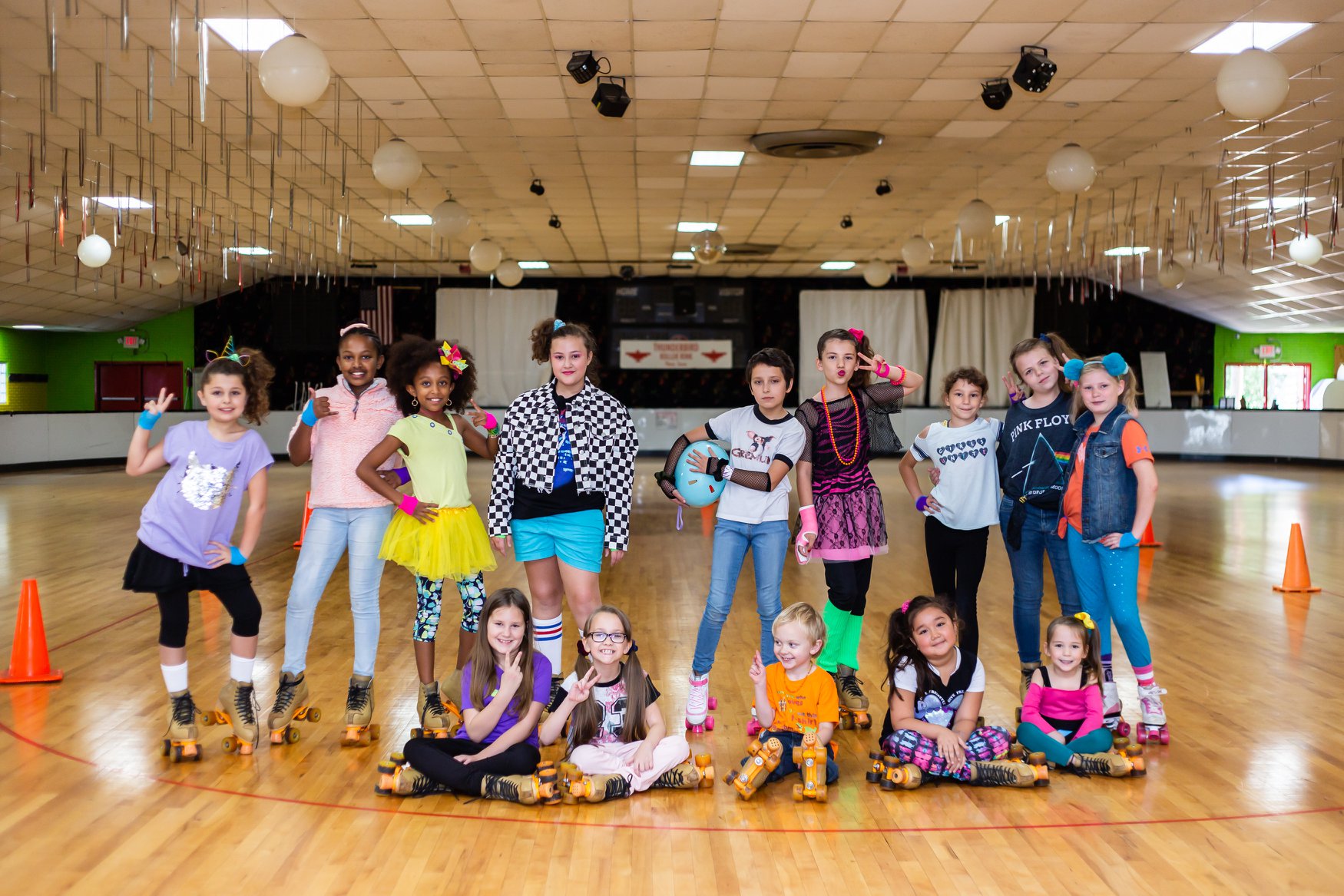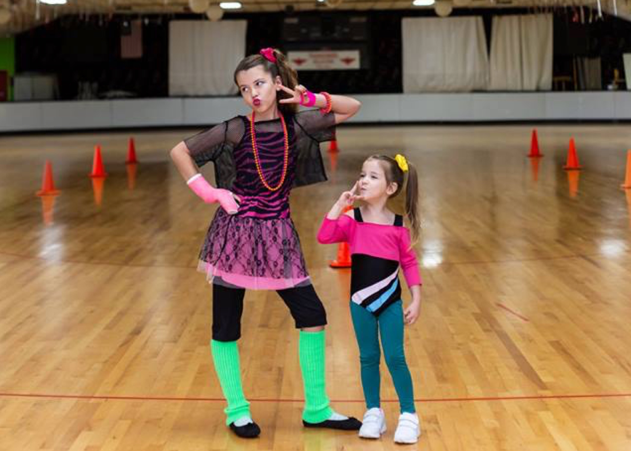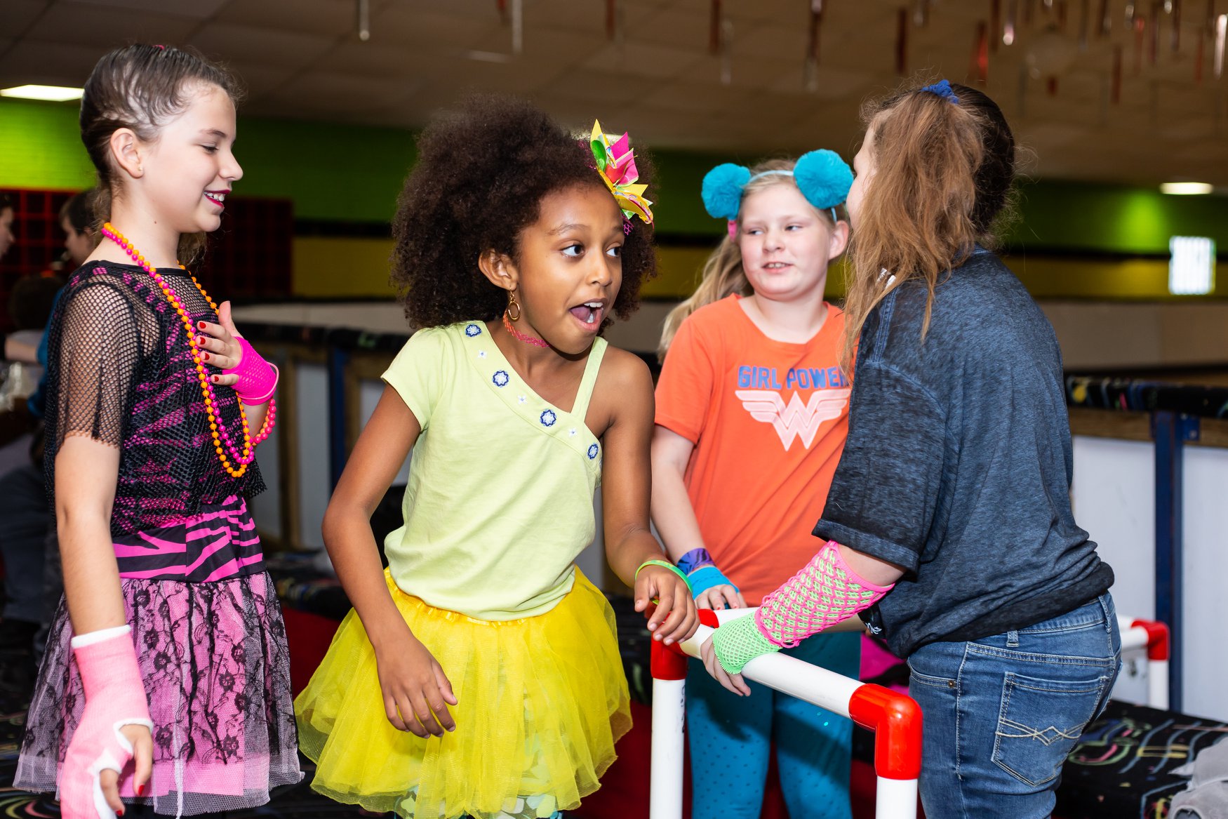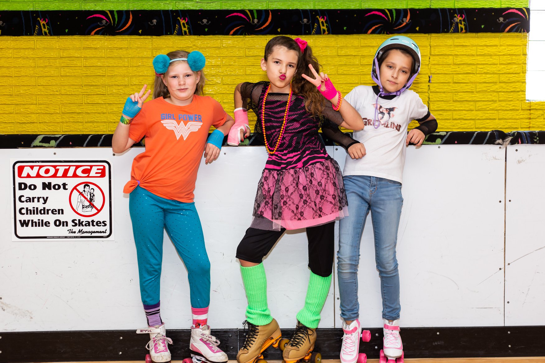 Olivia looked pretty in pink, donning a magenta lace-and-zebra ’80s outfit. Before lacing up their skates, the birthday girl and her 14 costumed friends loaded up on jelly bracelets, scrunchies, slap bracelets, fishnet gloves and slat sunglasses. Dayna noted that plenty of parents stayed around for the party to jam out to the rad tunes and take a spin around the rink themselves.