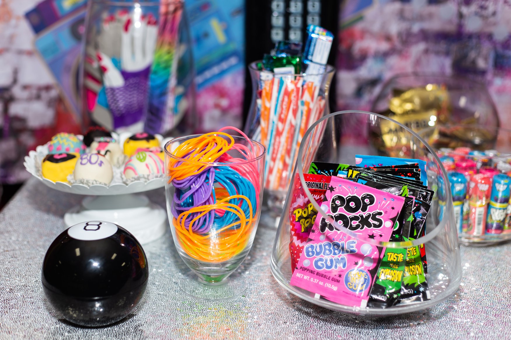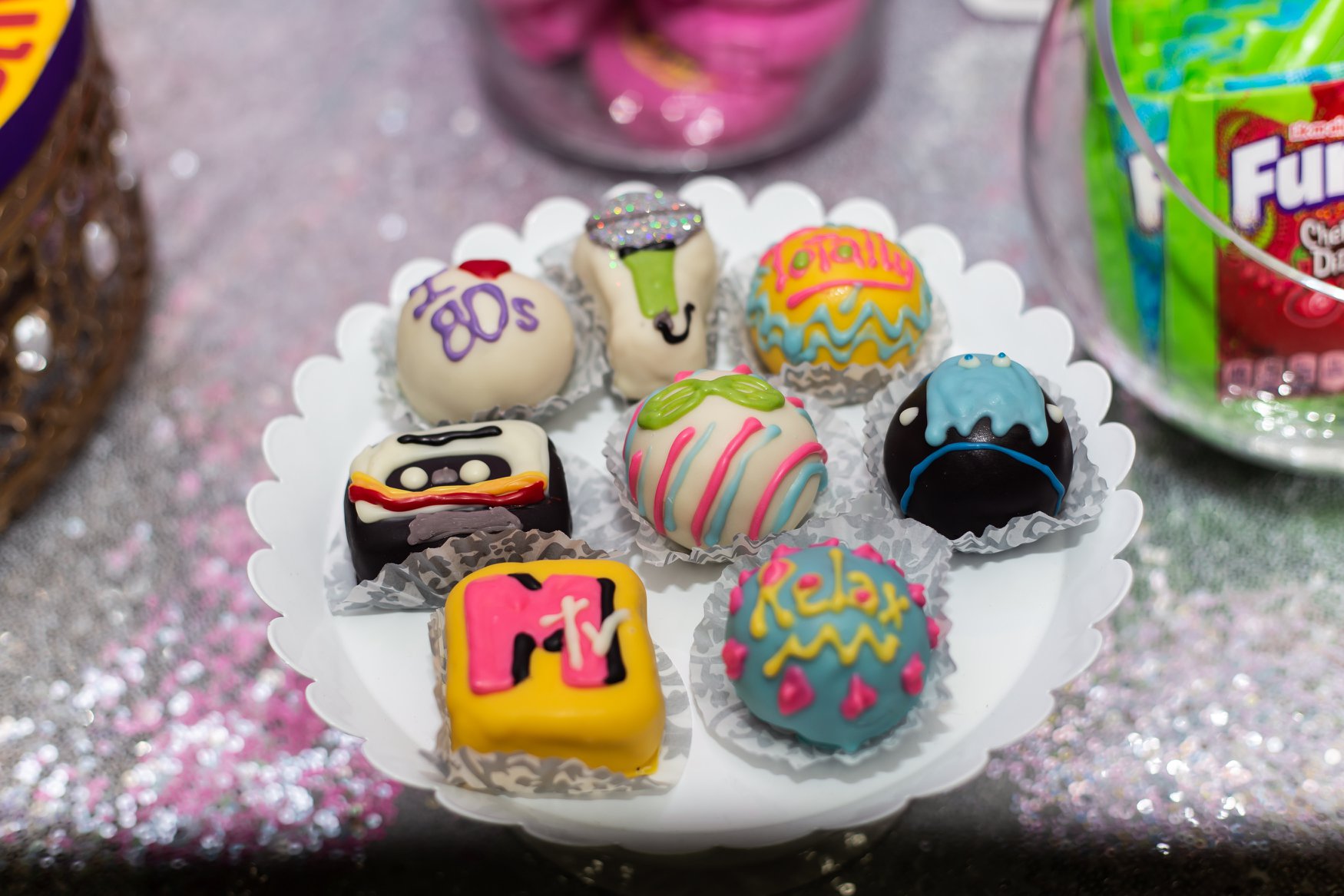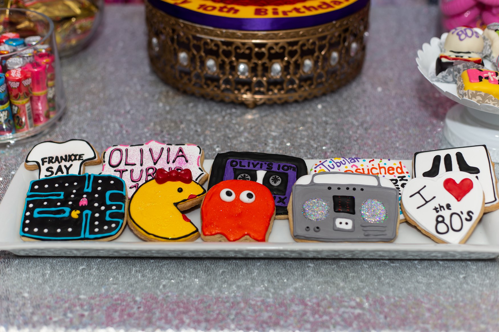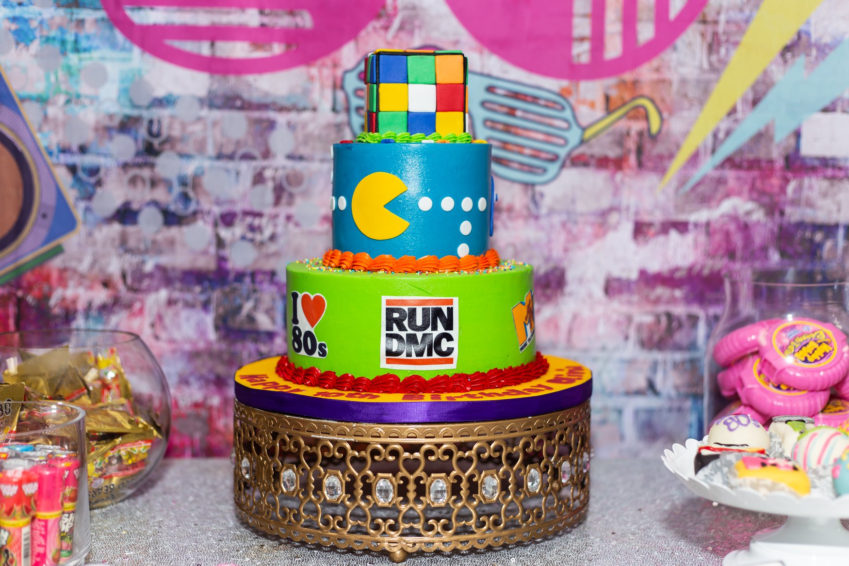 Guests munched on pizza and hot dogs, but the highlight of the party was the epically ’80s dessert table. An array of retro-themed cookies, cake balls and candies (like Fun Dip and Pop Rocks) surrounded the birthday cake. The three-tiered confection was decorated to reflect the decade’s biggest trends like Rubix Cubes, Pac-Man and even Run-DMC.