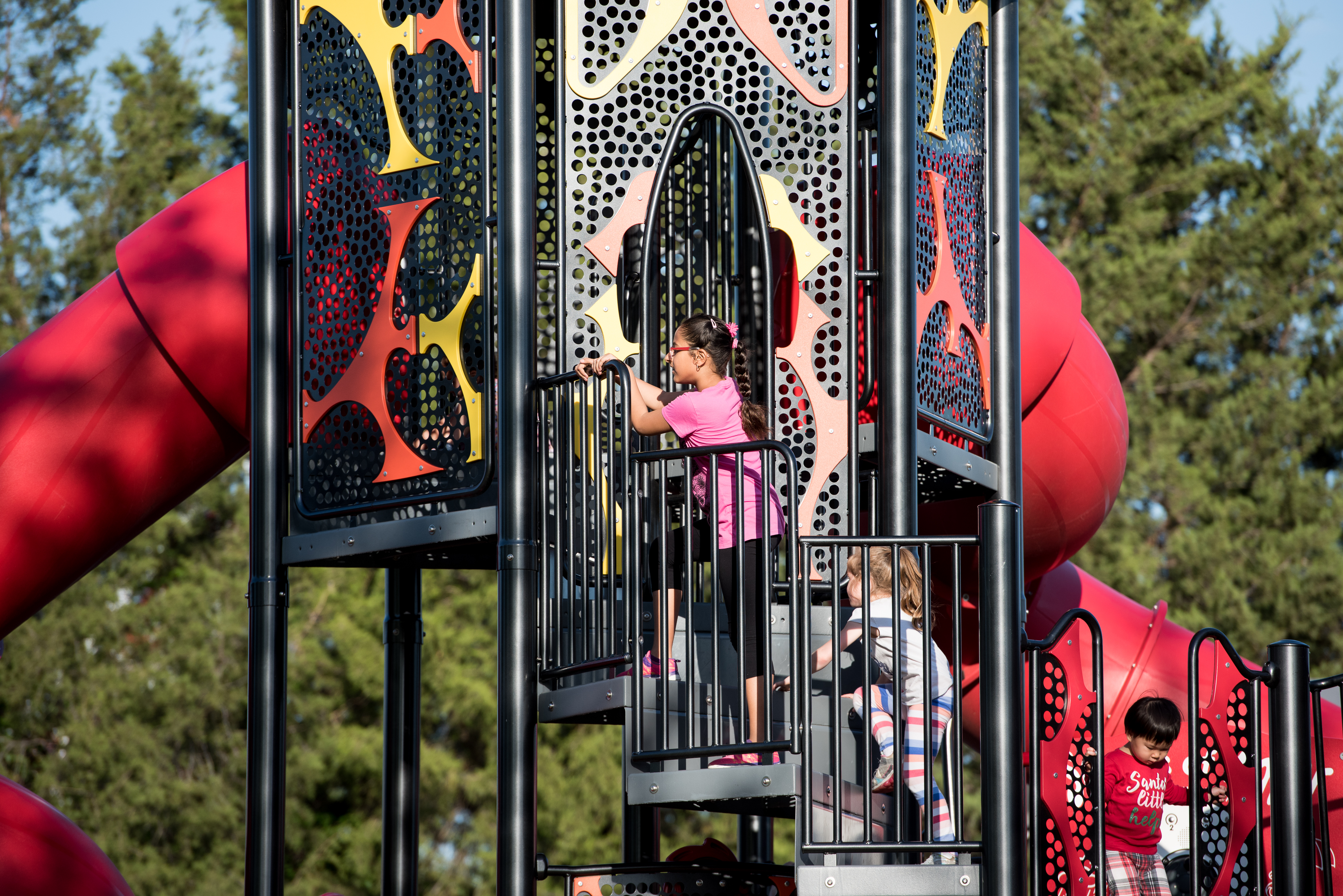 Best for: Safety-minded kids of all ages. This neighborhood playground takes inspiration from the nearby fire station for its first responder theme, which gives kids the choice to play pretend firefighter, police officer or emergency medic. (Additional safety measures include separate play areas for toddlers and bigger kids.) Tiny tots ages 2- to 5-years-old will enjoy the blue police station-themed play structure, outfitted with plenty of slides and even a pint-size cop car. The shaded play structure for 5- to 12-year-olds is modeled to look like a red fire station, and features play equipment like slides, climbing tower and (yes, of course) sliding pole.