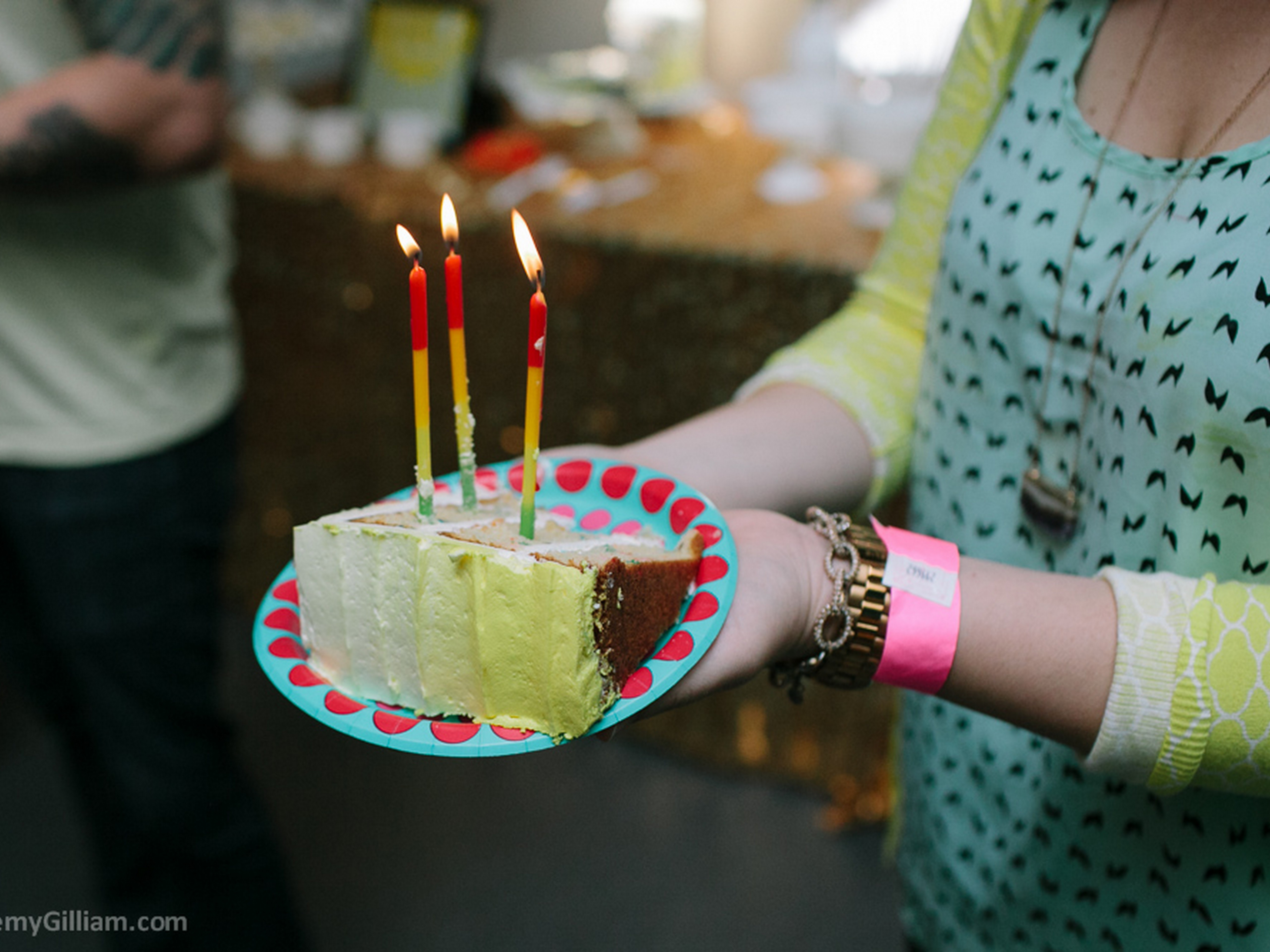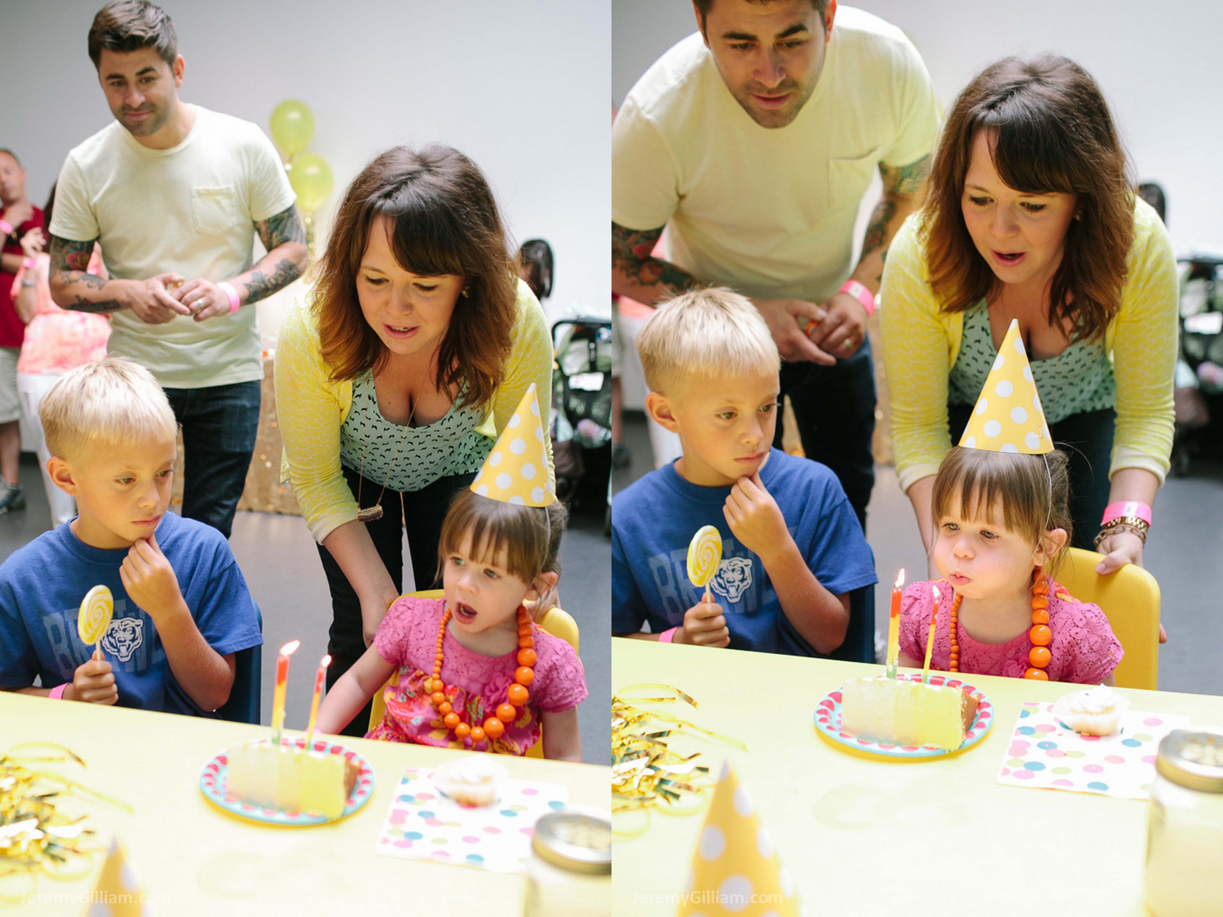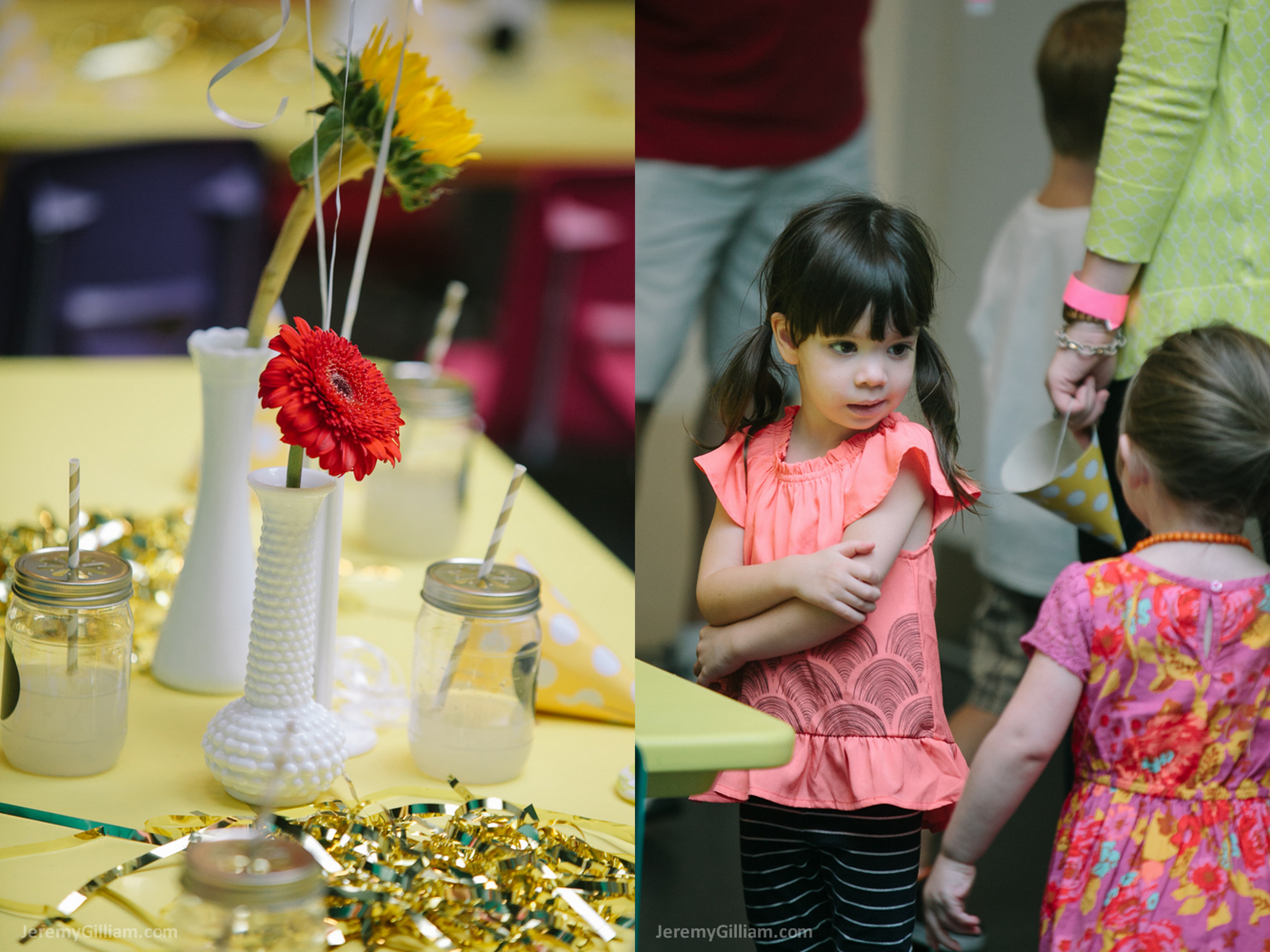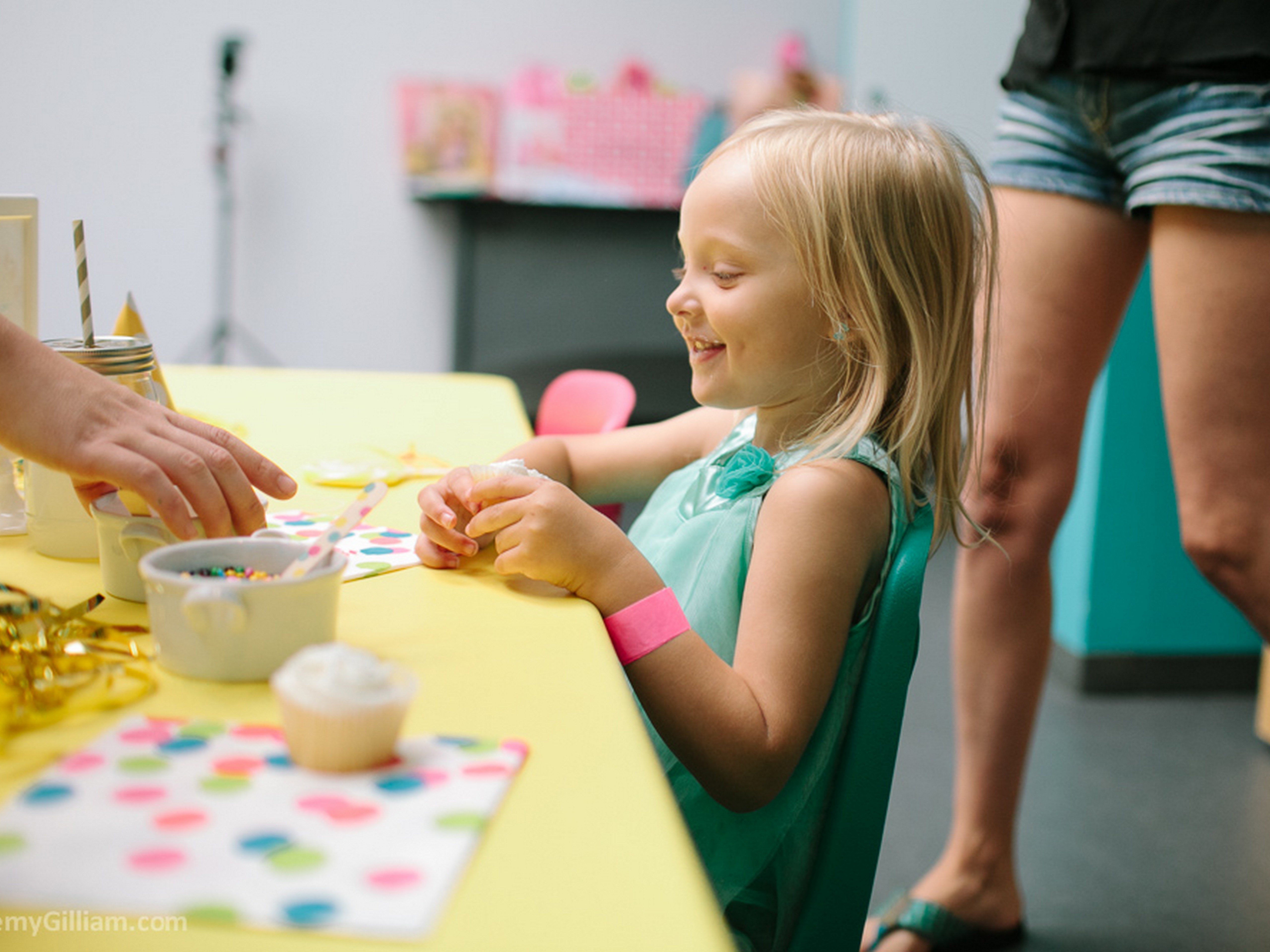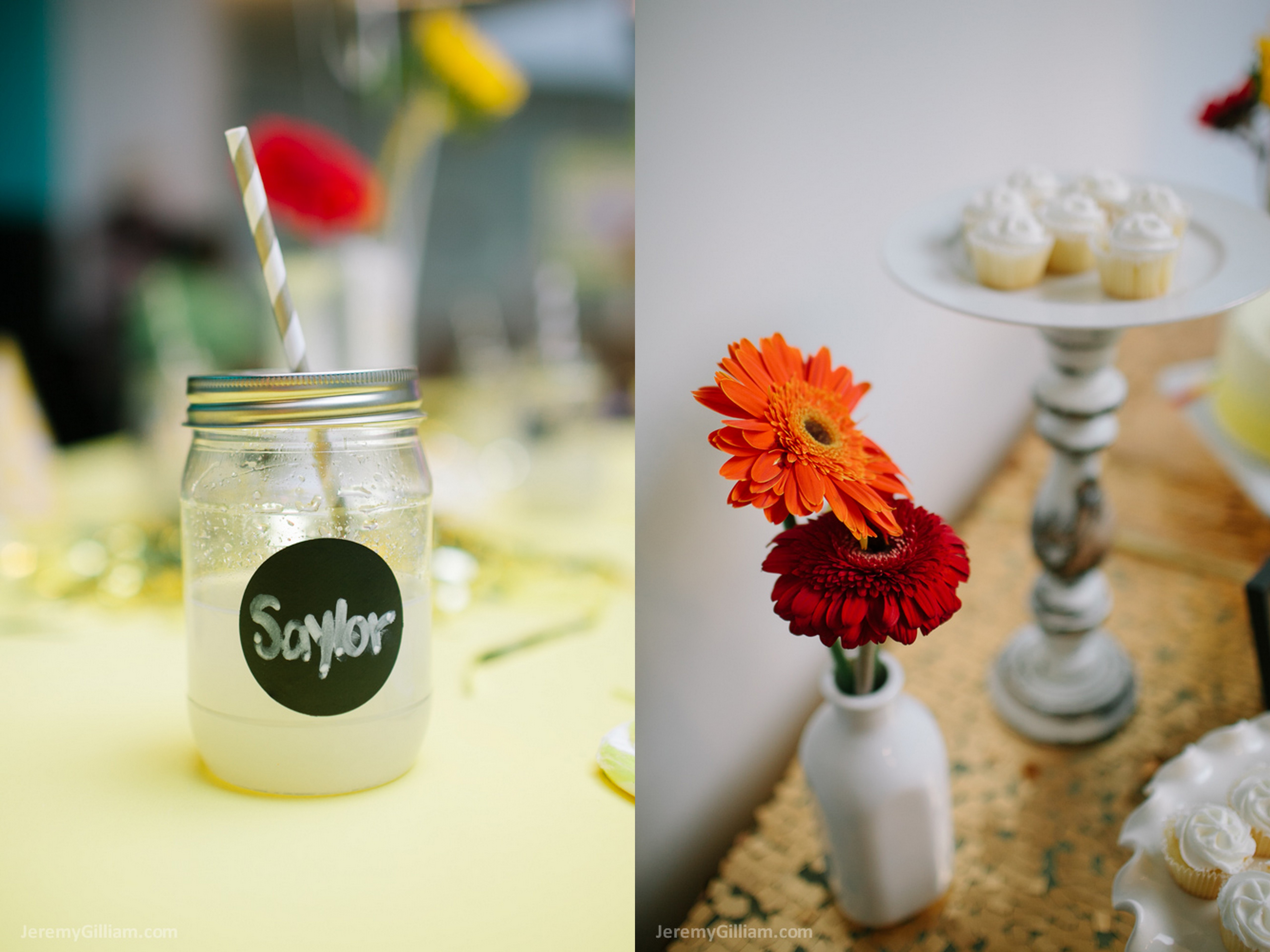 Upon arrival, Saylor and friends beelined for tables set with polka dot party hats and oversized suckers before slurping lemonade out of plastic mason jars through striped straws and munching on powdered doughnuts. Before cutting into Saylor’s lemon-flavored, ombre birthday cake, partygoers decorated cupcakes with candies and sprinkles, having a blast making a mess as they went.