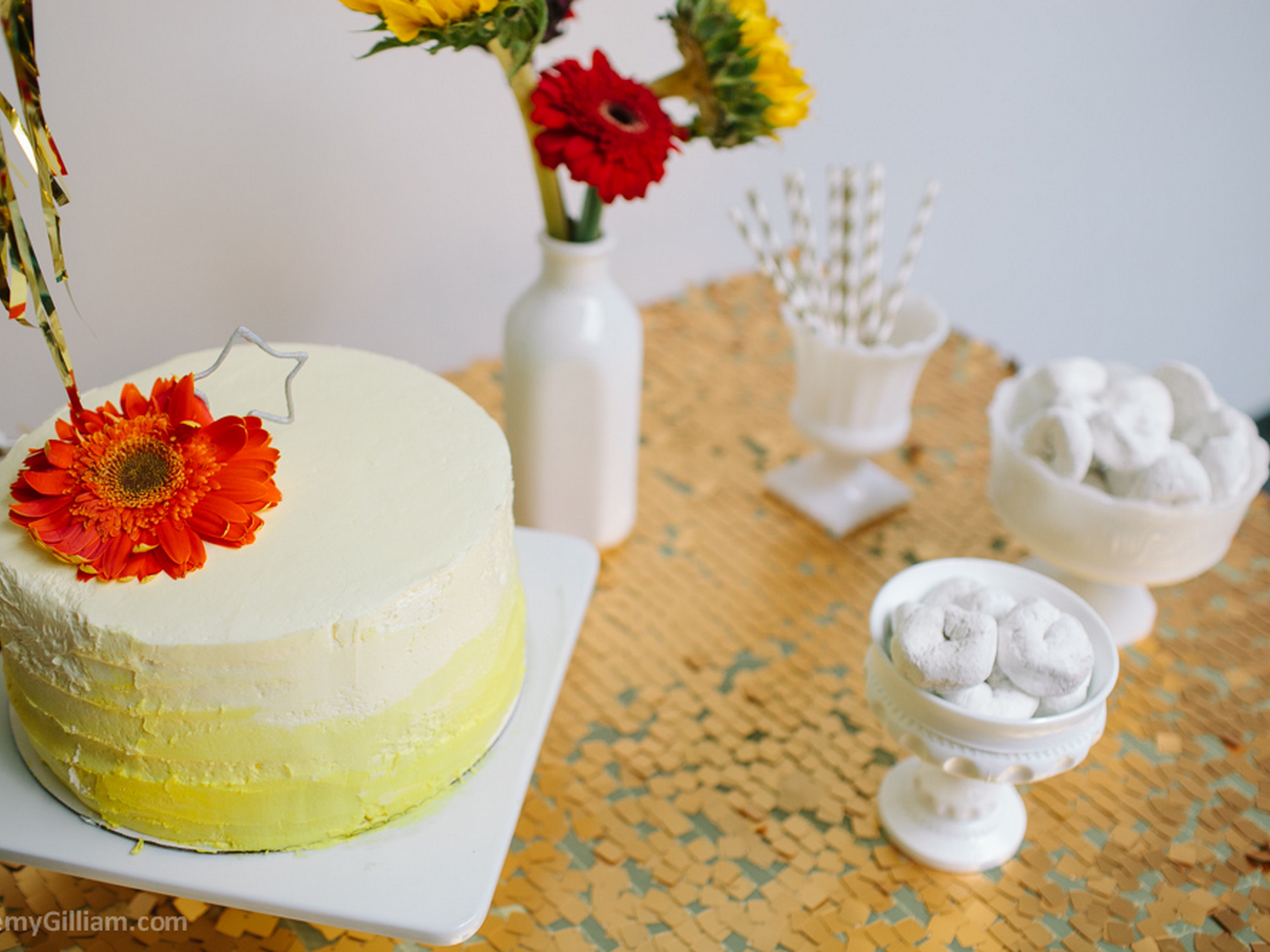 Ultimately, Lottie decided to take the sunshine theme and run with it. Using balloons, fresh sunflowers, lots of polka dots and a wash of primary yellow, Lottie transformed a monotone party room from dull and drab to bright and cheery.
